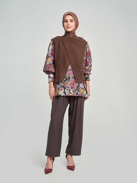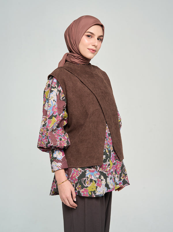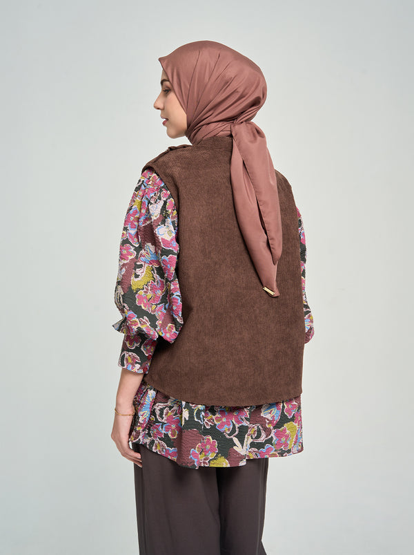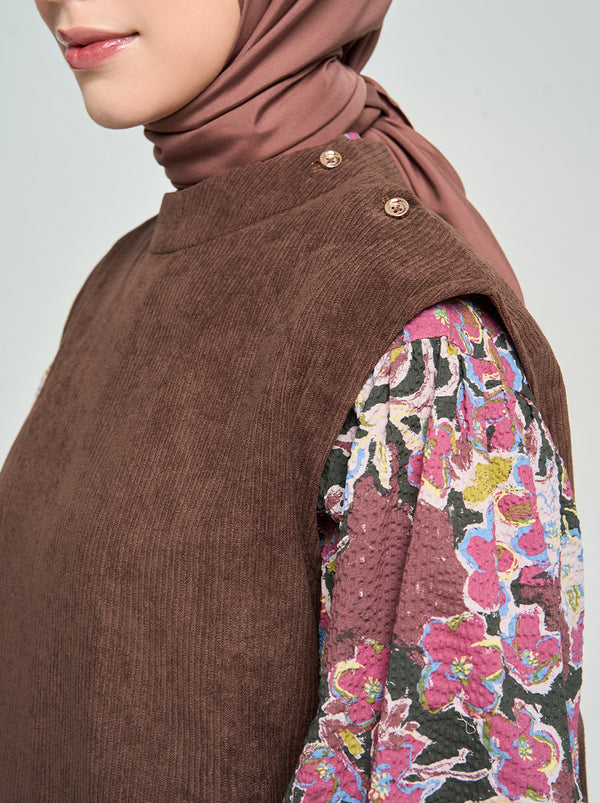 Outer tanpa lengan yang chic, terbuat dari korduroi beludru yang lembut, dengan detail kancing di bahu untuk styling.