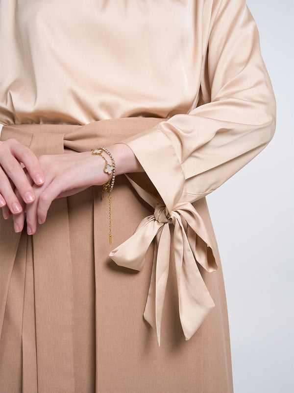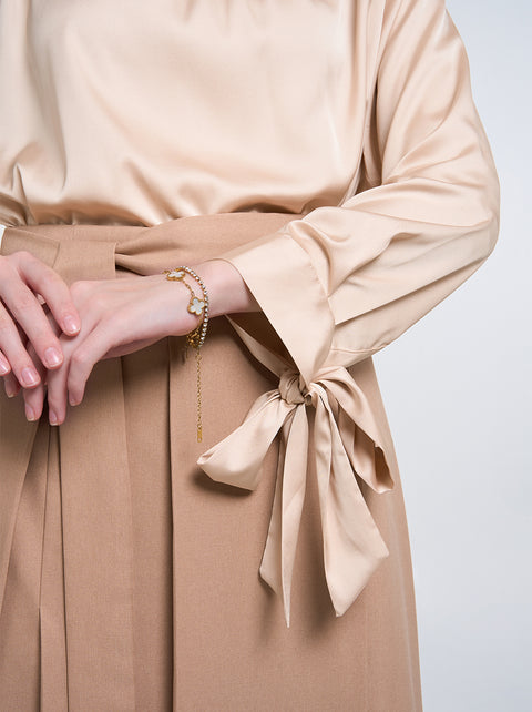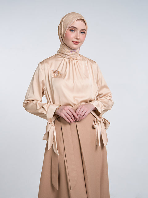 The Aruna Top seamlessly combines feminine elegance with everyday comfort. This stylish piece is adorned with adjustable tie cuffs, making it a versatile choice for layering or wearing on its own.