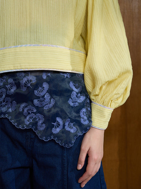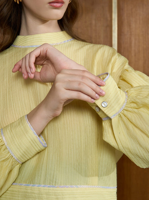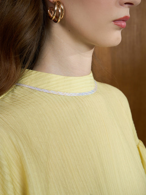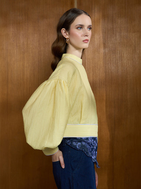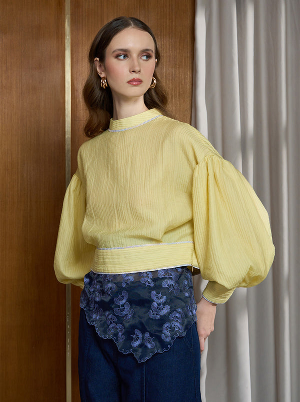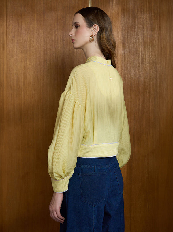Make a statement with Carin top's volume play on the sleeves, cropped design and punching colors. The ligtweight fabric is accented with texture and a touch of contrasting colors.