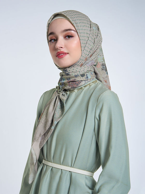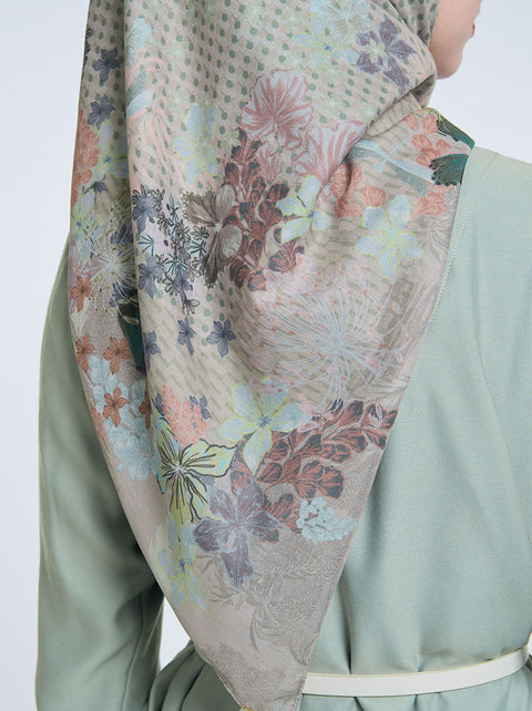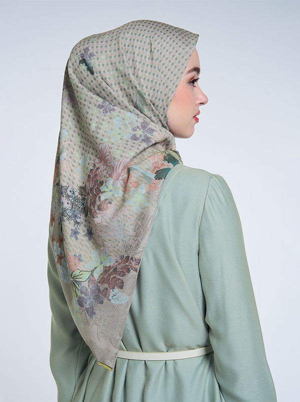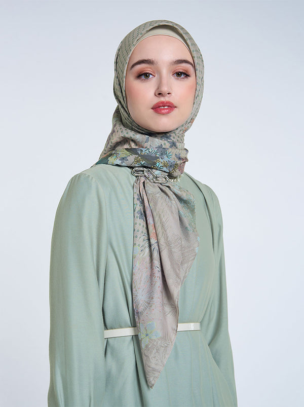 Signature Scarf Cedarra dibuat dari bahan airy voile yang ringan dan sejuk, menampilkan perpaduan harmonis antara ilustrasi hutan hujan tropis yang indah dan pola geometris yang terstruktur.