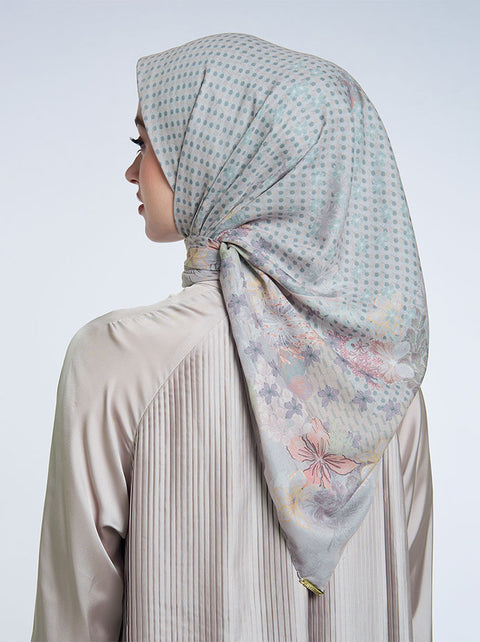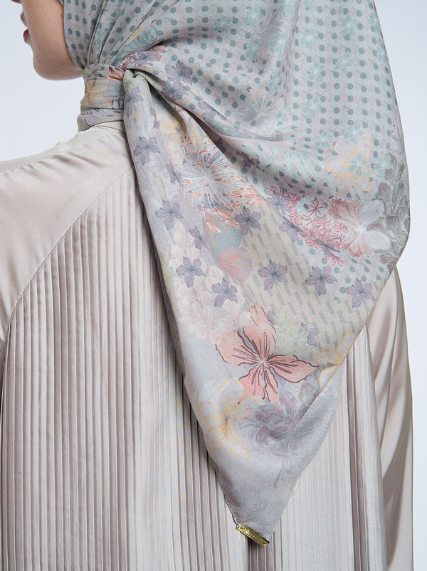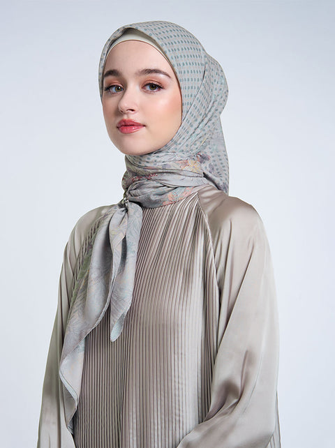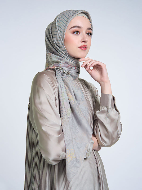 Signature Scarf Cedarra dibuat dari bahan airy voile yang ringan dan sejuk, menampilkan perpaduan harmonis antara ilustrasi hutan hujan tropis yang indah dan pola geometris yang terstruktur.
