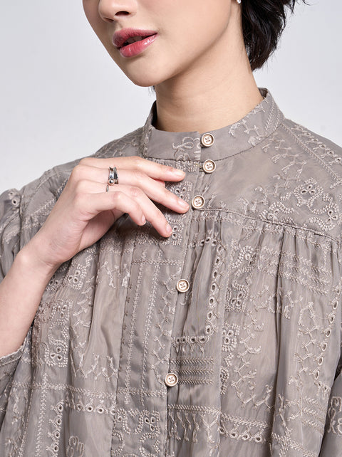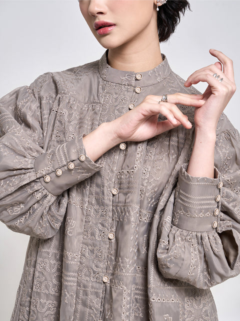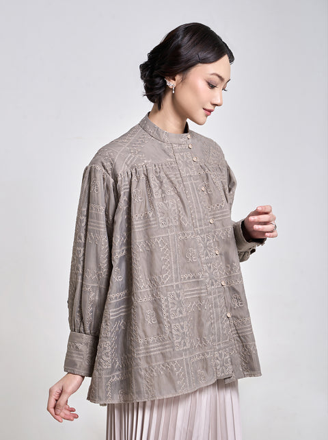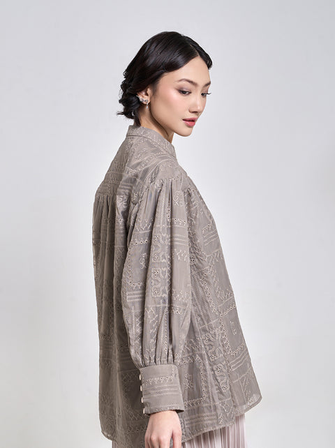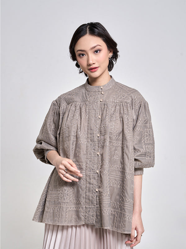 Atasan cantik dengan elemen-elemen yang tidak lekang waktu. Chazna top hadir dengan bordir khas Kami pada bahan renda dengan detail kerut, untuk busana Raya yang simpel dan memukau. Kancing emas memberi efek kontras yang mewah.
