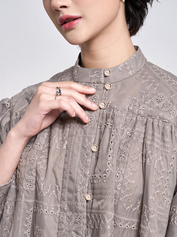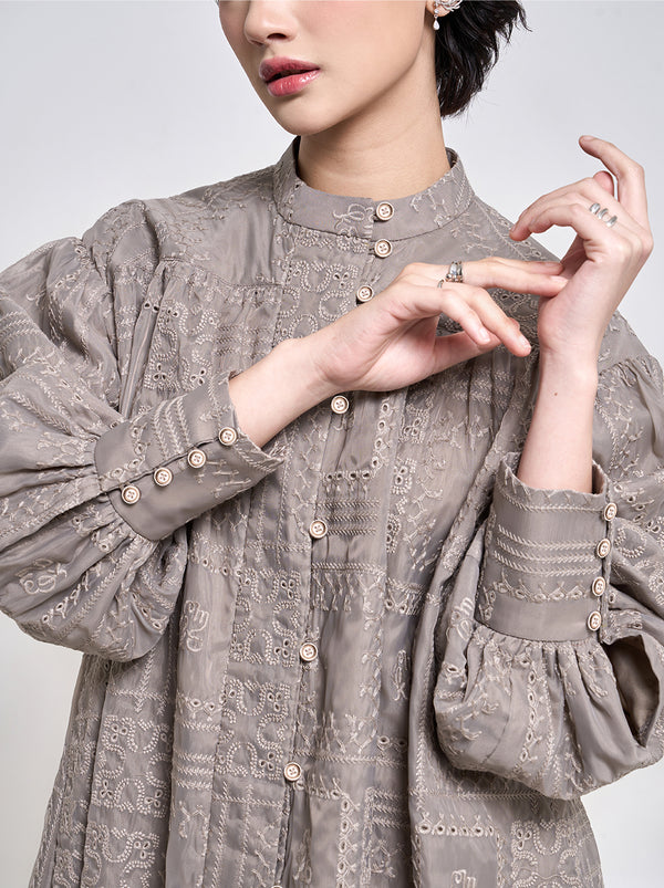 A special top with timeless elements. Chazna top features Kami. signature embroideries on ruched lace, for an easy impactful Raya look. The golden buttons give contrast and lux finish.