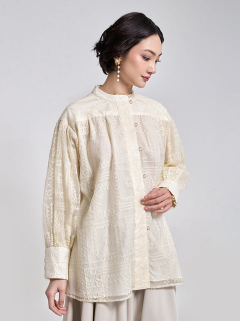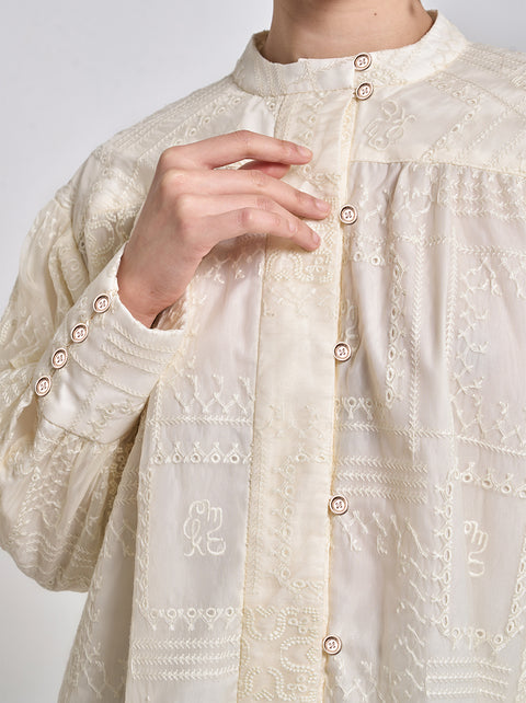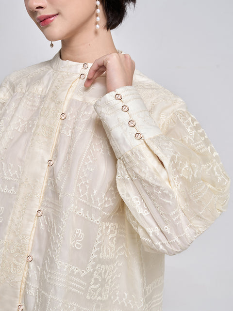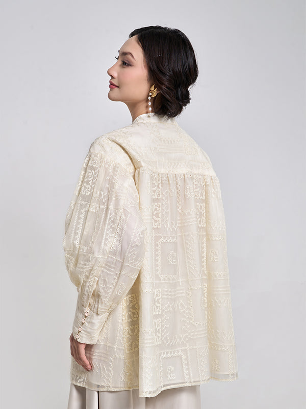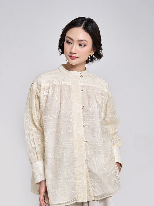 A special top with timeless elements. Chazna top features Kami. signature embroideries on ruched lace, for an easy impactful Raya look. The golden buttons give contrast and lux finish.