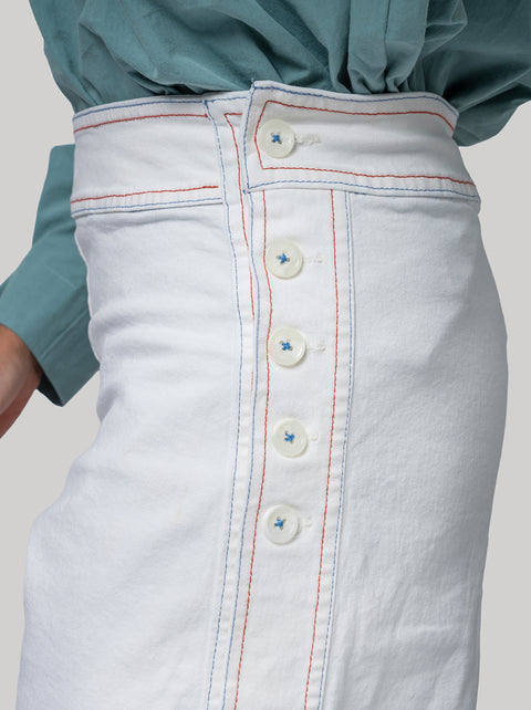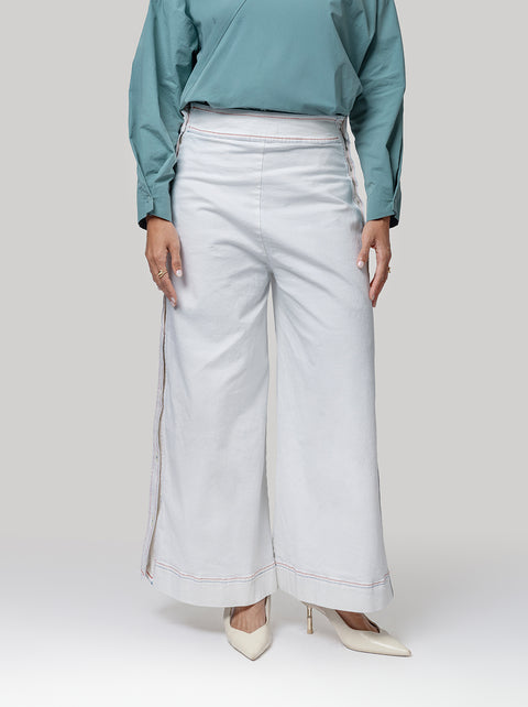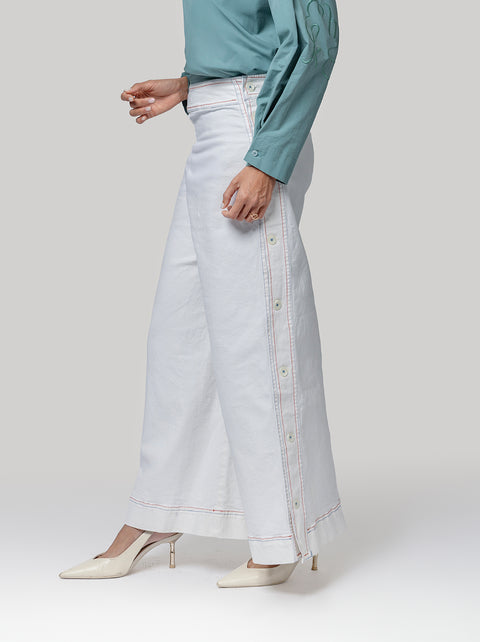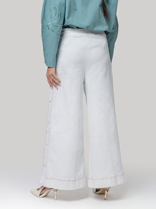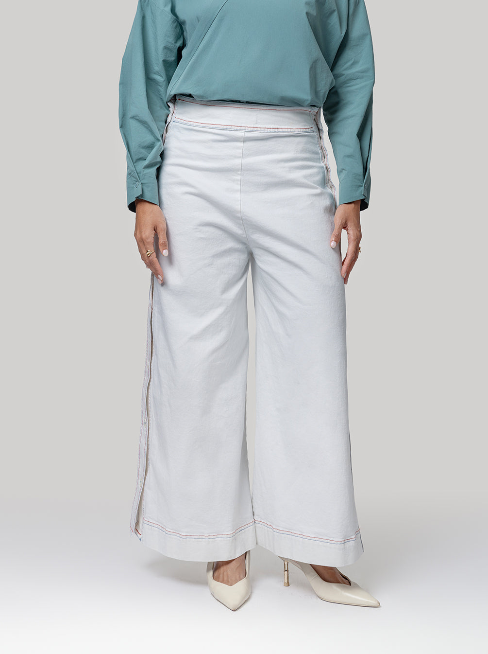 Elinea pants is fresh and versatile. Featuring colorful stitching over the wide silhouette, and active buttons down the sides. Style it your way as a modern statement.