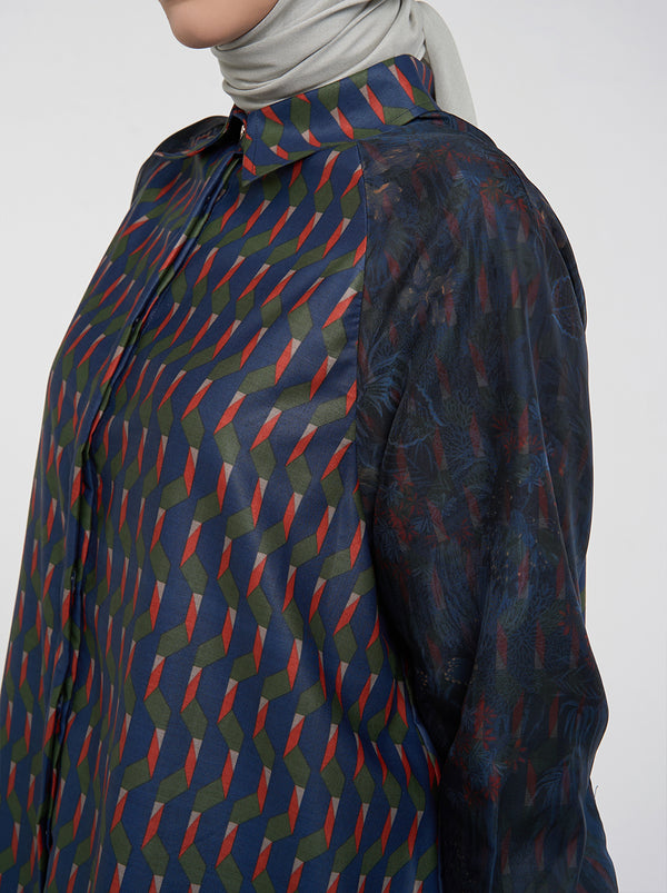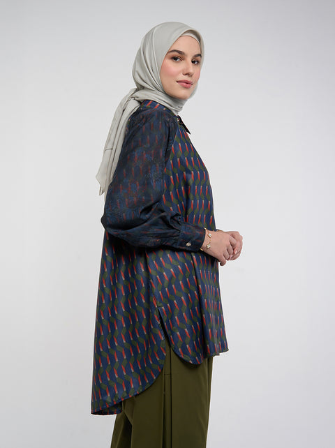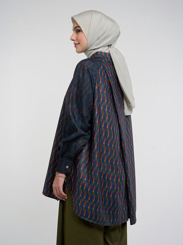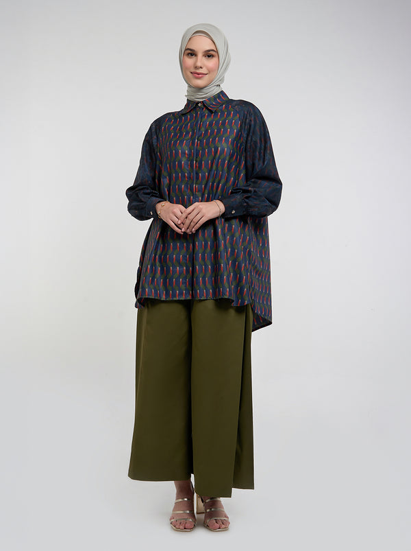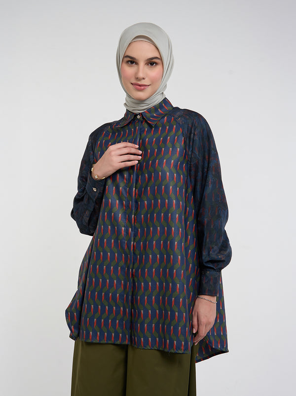 A raglan-sleeved shirt with folded back details and the signature Cedarra pattern. The structured collar adds a polished touch, perfect for an effortlessly stylish ensemble.