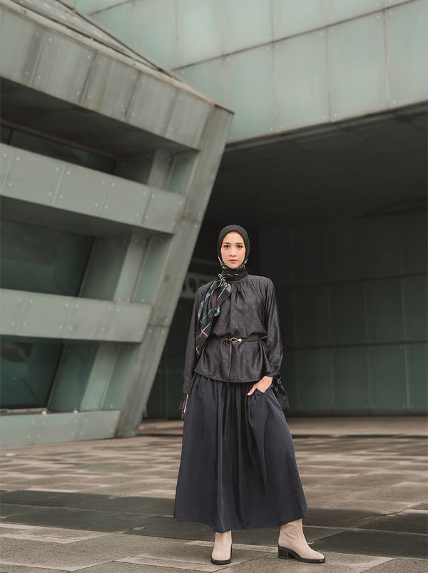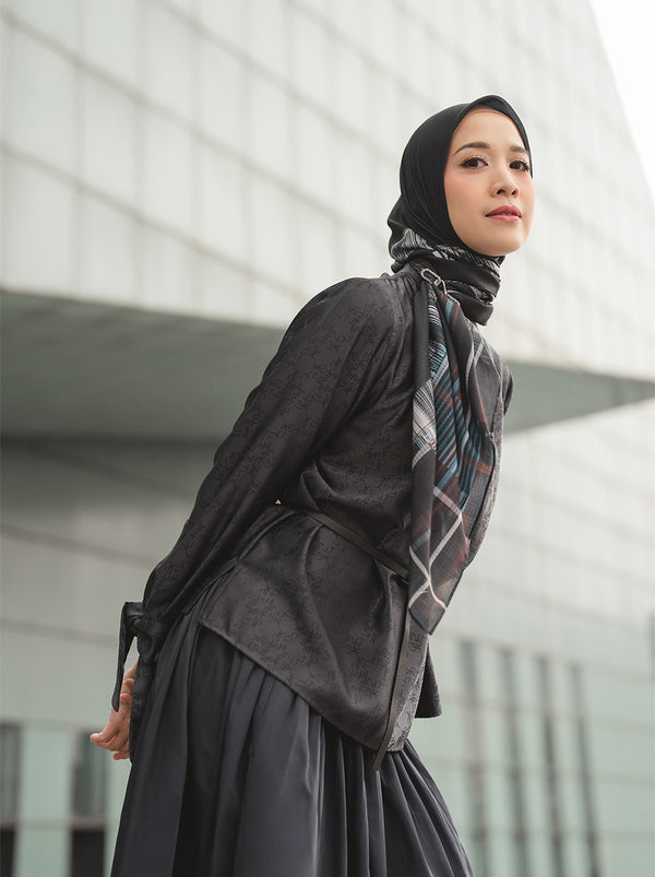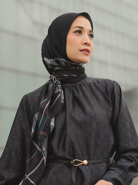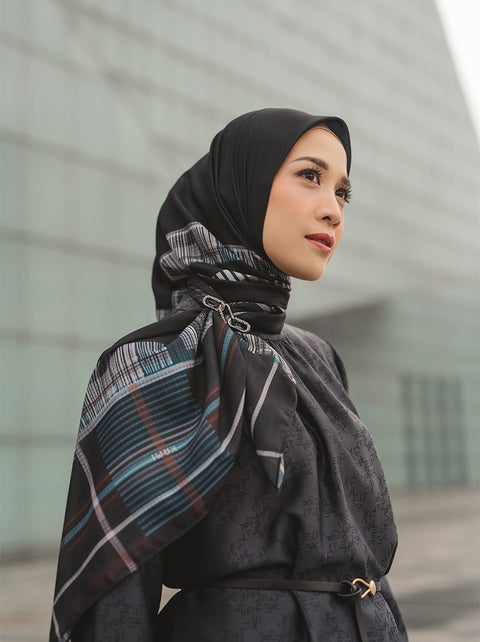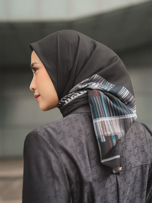 Hema scarf yang minimalis terinspirasi dari garis desain modern dan arsitektur perkotaan sebagai pengingat akan progres dan kemajuan.
