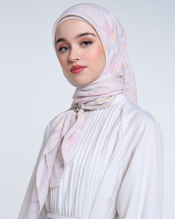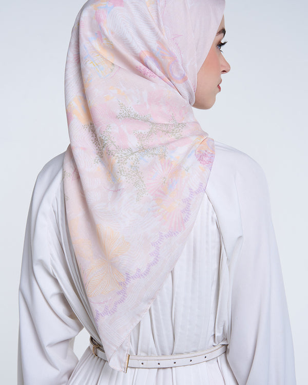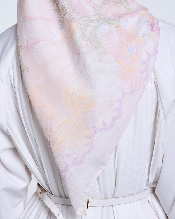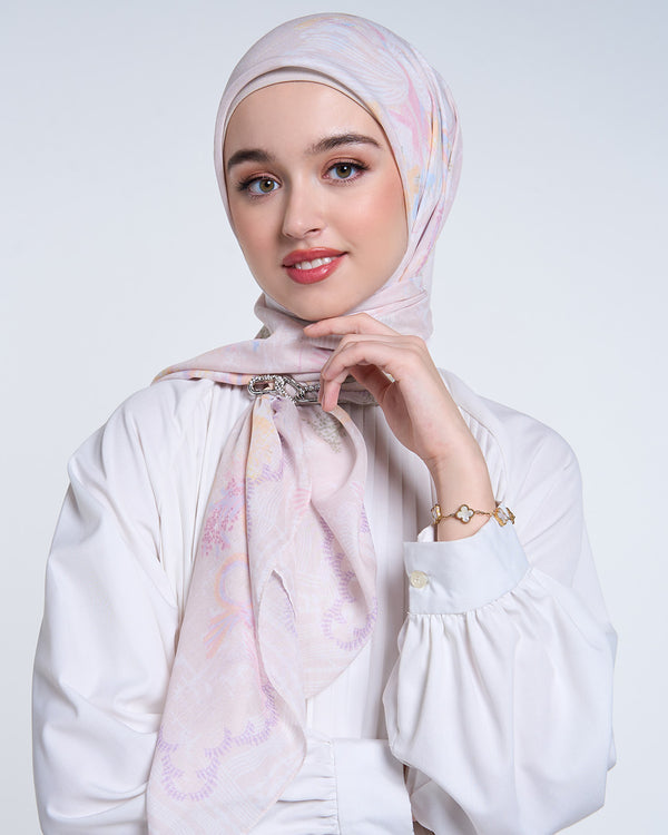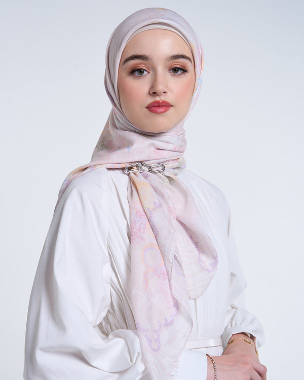 Signature scarf yang terbuat dari bahan airy voile, menampilkan warna-warni dengan pola elemen oriental, sempurna untuk kamu yang penuh warna dan senang mengekspresikan diri.