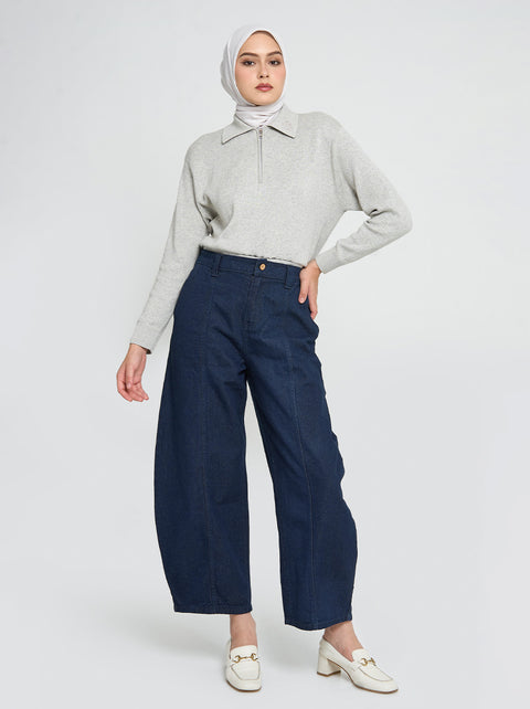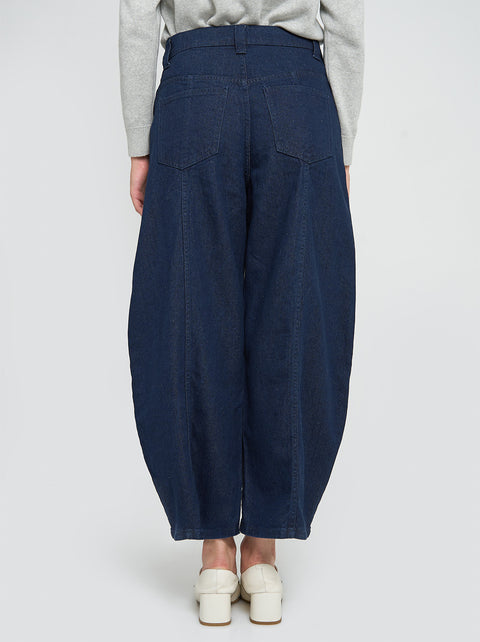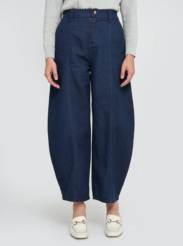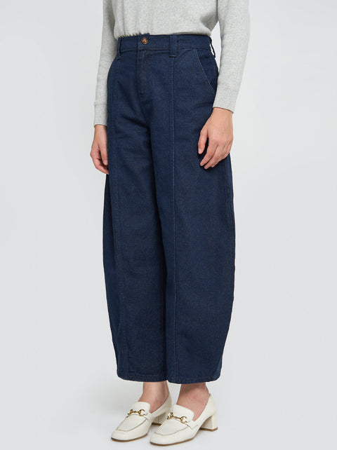 Celana jeans model balon yang nyaman dengan detail jahitan di depan dan saku di kedua sisi.
