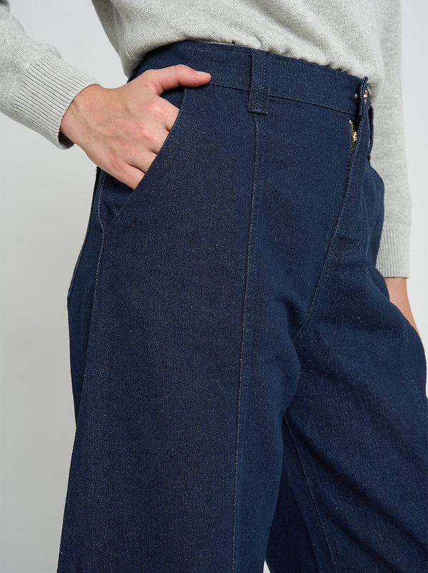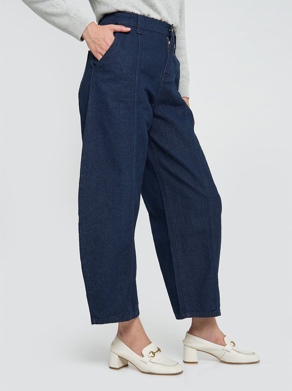 A relaxed barrel jeans with seams details down the pipe and side pockets.