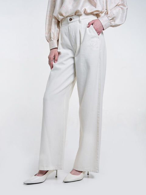 Jeans potongan lurus yang terbuat dari katun. Dilengkapi dengan lubang ikat pinggang, kancing berukir, saku koin depan, saku belakang, bordir logo Kami, serta detail lipit untuk menambah gayamu!