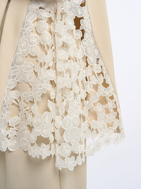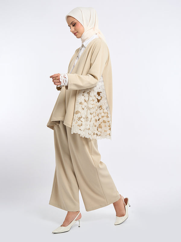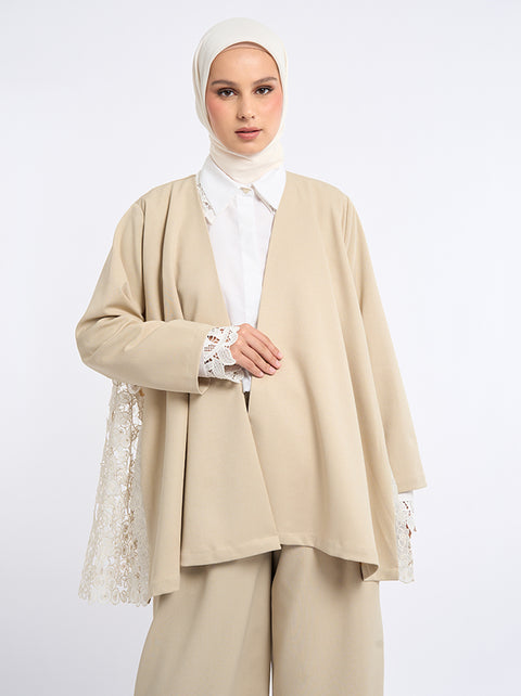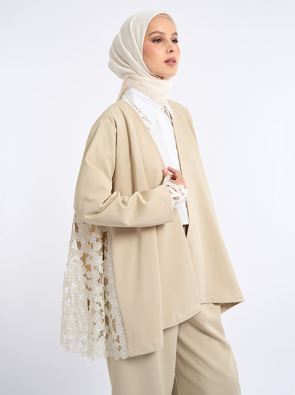 Kala Outer terbuat dari bahan polytwill yang nyaman, dilengkapi dengan bordir organza bermotif Kalli yang dijahit rapi pada sisi lapisan luar outer.