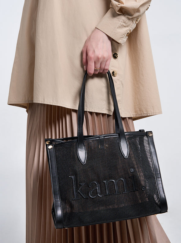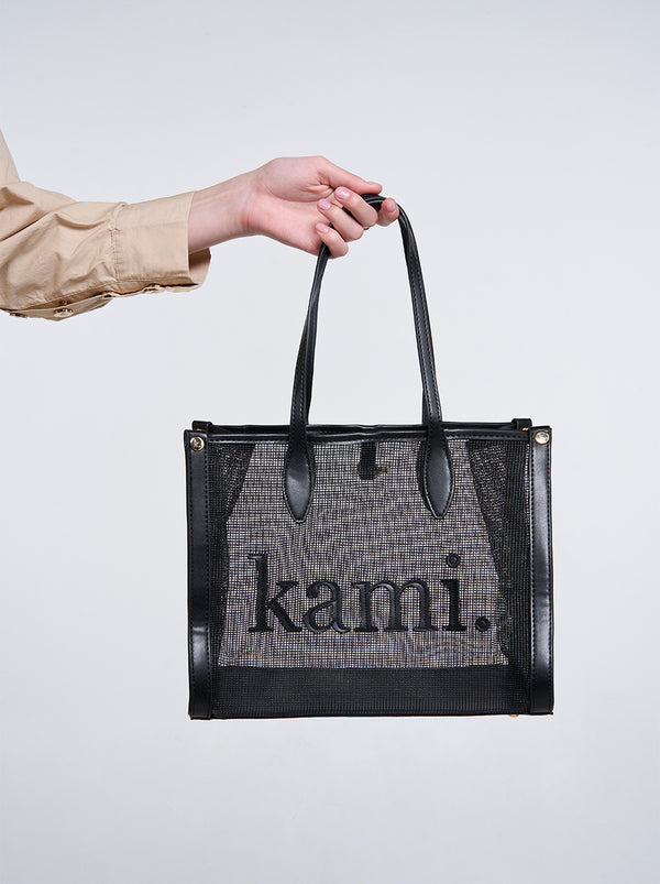 Carry all your essentials with the Kami. Net Bag! Its modern net design, featuring a cutout leather Kami. logo, blends a stylish textured element with a playful feel. It is also equipped with a matching detachable pouch inside, making it both trendy and versatile.