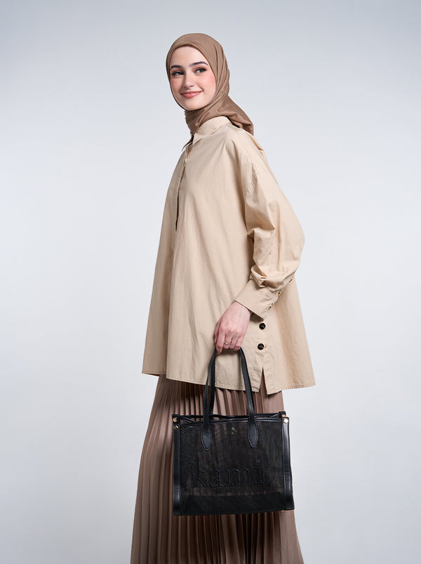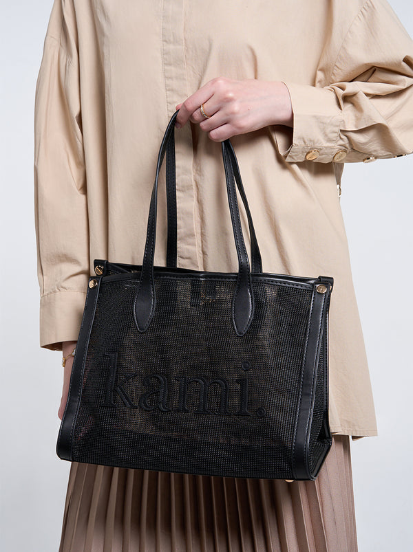 Bawa semua barang penting Anda dengan Kami. Net Bag! Desain jaring modernnya, dengan logo kulit Kami. yang dipotong rapi, memadukan elemen tekstur yang stylish dengan nuansa muda. Bagian ini juga dilengkapi dengan pouch yang dapat dilepas-pasang, menjadikannya trendi dan serbaguna.
