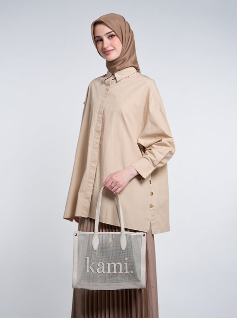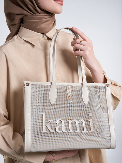 Bawa semua barang penting Anda dengan Kami. Net Bag! Desain jaring modernnya, dengan logo kulit Kami. yang dipotong rapi, memadukan elemen tekstur yang stylish dengan nuansa muda. Bagian ini juga dilengkapi dengan pouch yang dapat dilepas-pasang, menjadikannya trendi dan serbaguna.
