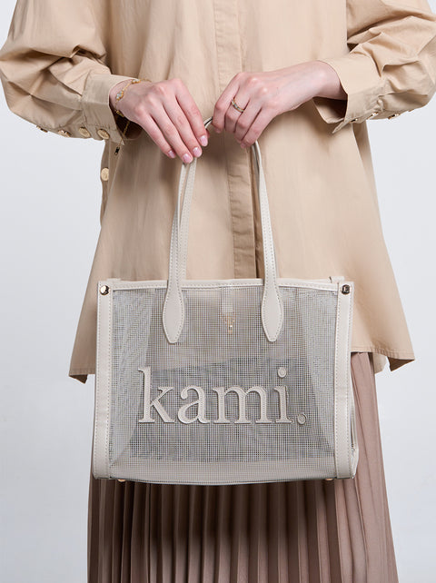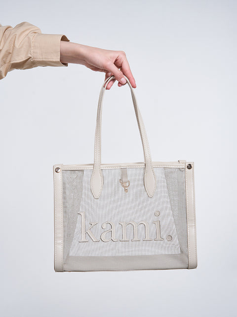 Carry all your essentials with the Kami. Net Bag! Its modern net design, featuring a cutout leather Kami. logo, blends a stylish textured element with a playful feel. It is also equipped with a matching detachable pouch inside, making it both trendy and versatile.