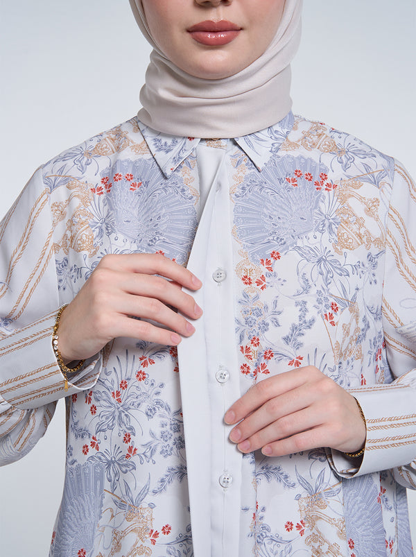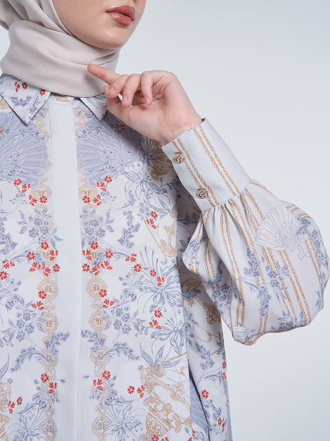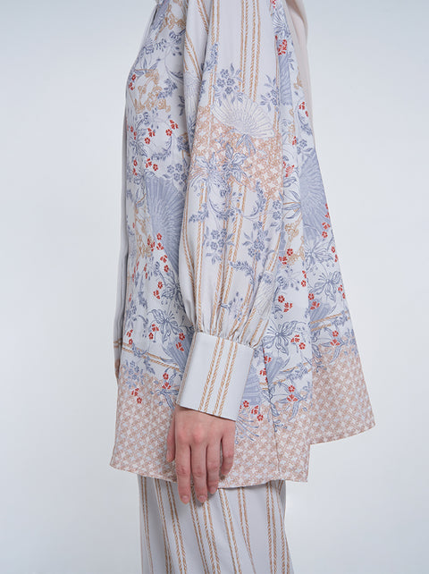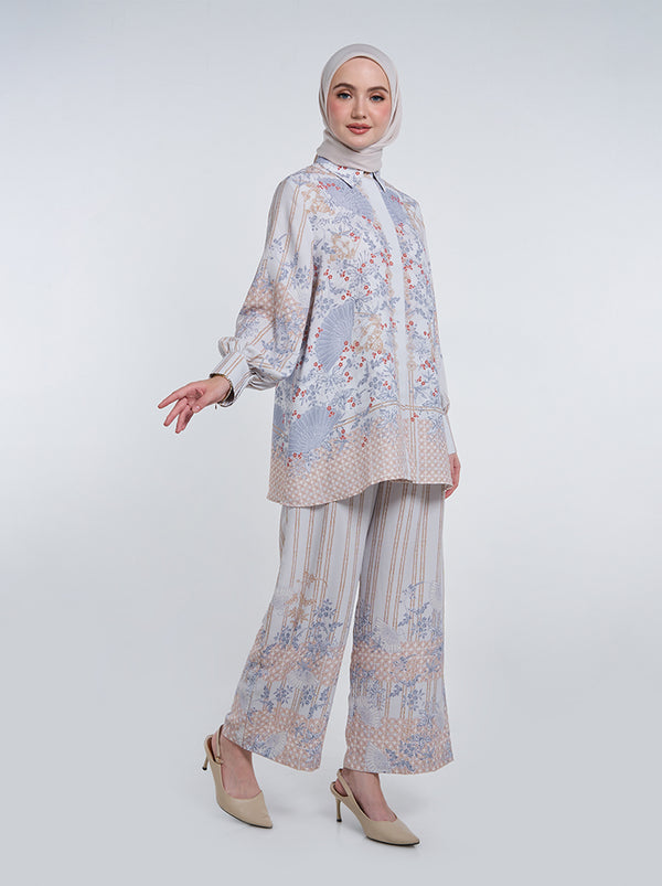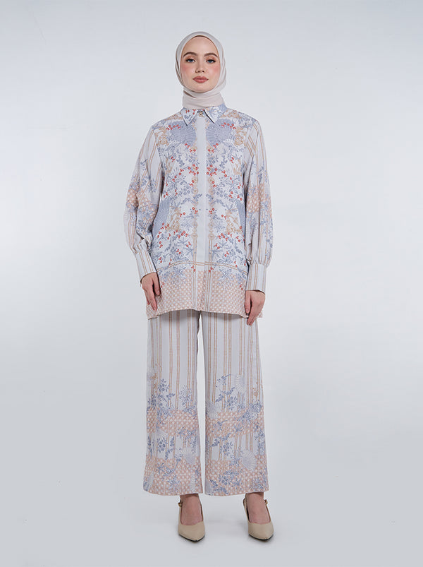Kemayu Top is a fitted shirt with subtle puffy sleeves. The Nuansa pattern will be the spotlight on the front, symmetrically crafted for a luxurious look.