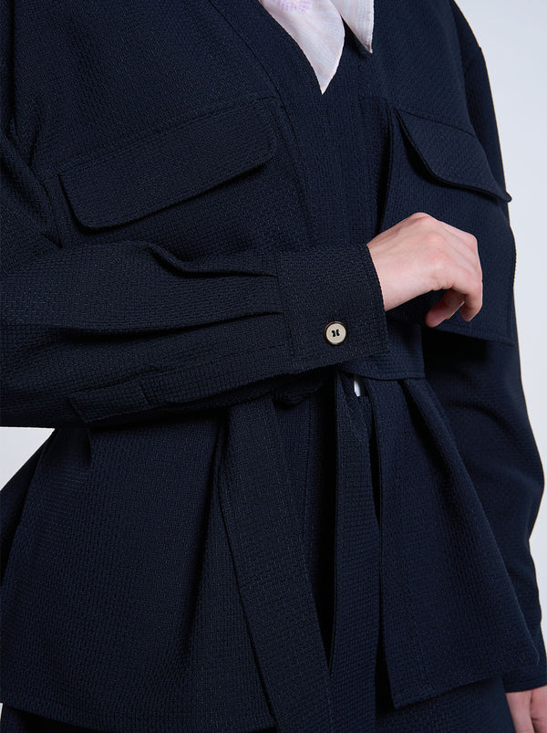 The Kiza Outer is an oversized, long-sleeved piece crafted from textured polyester. This trendy outer features functional front pockets, which add both style and practicality.
