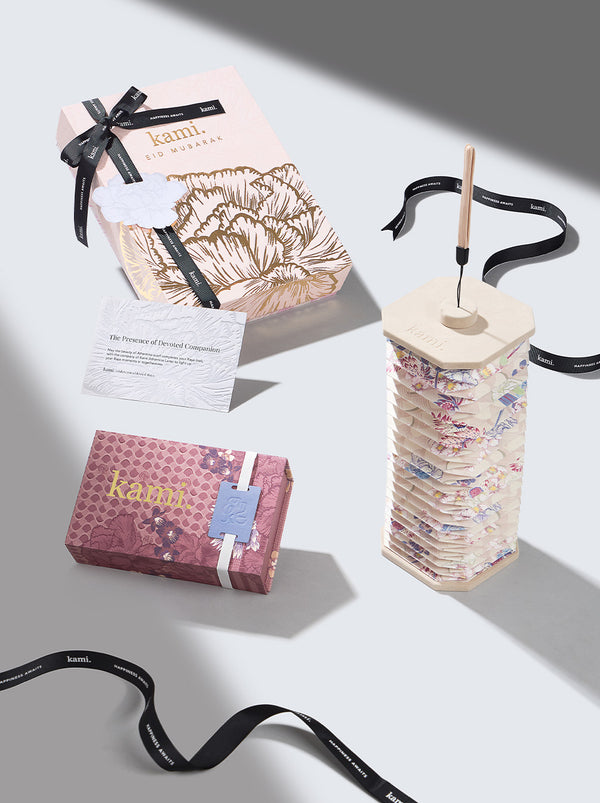 The beautifully curated hampers include Kami.'s Athemina Scarf, offering a perfect blend of elegance and serenity for your sacred moments. Celebrate #LebaranAlaKami with peace and comfort.