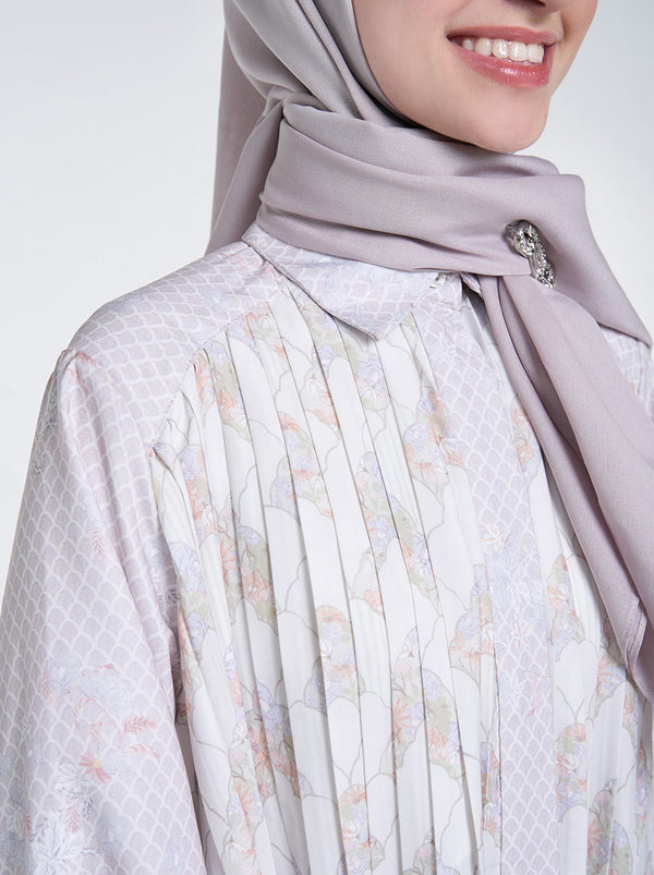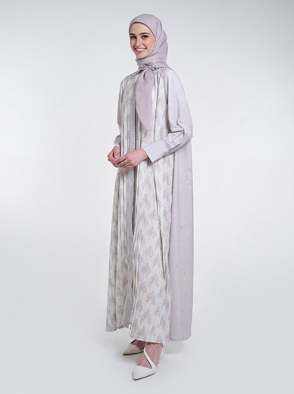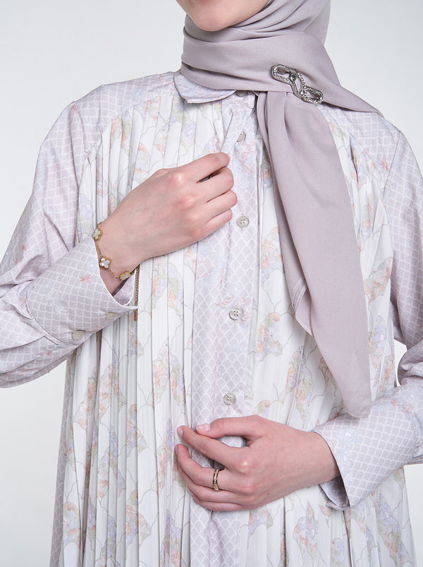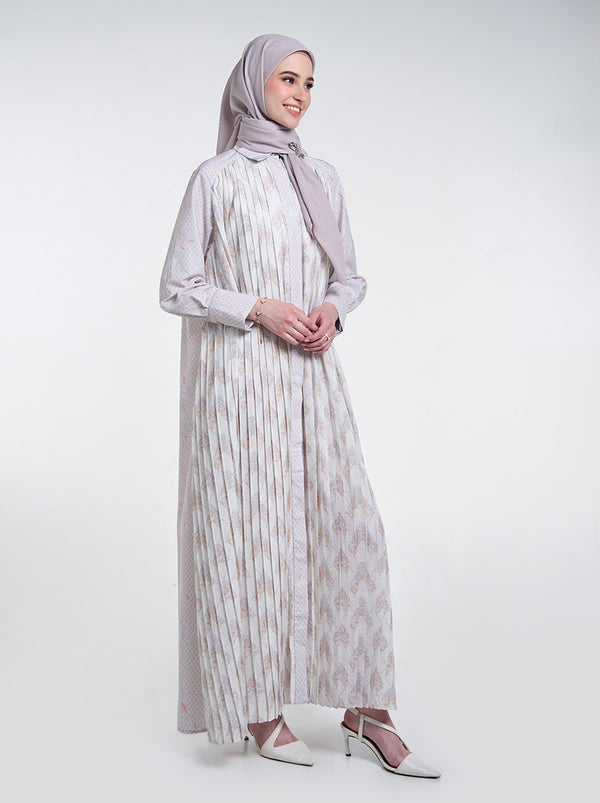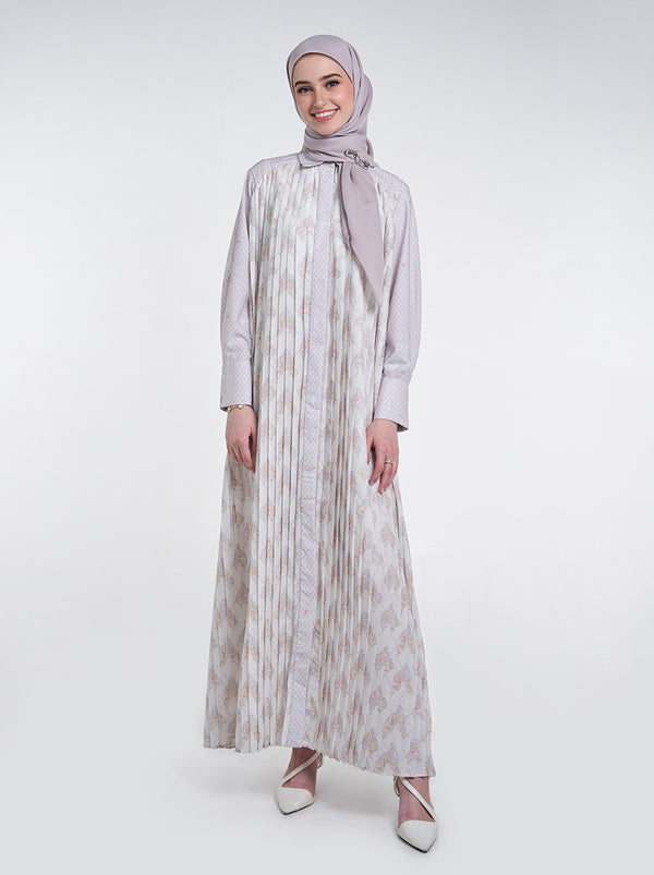 The Moza Dress is a symmetrical pleated masterpiece, featuring hidden front buttons for effortless styling. Its gathered details at the back seamlessly combine patterns for a captivating look.