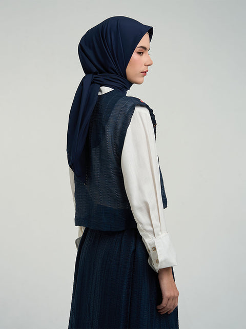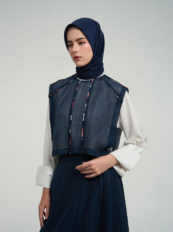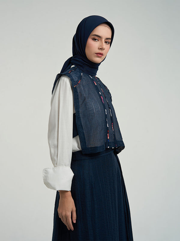 Find a modern outer in Sammy Vest. The textured sheer material and patterned lists add style, without adding more weight. Completed with unique button openings on the side pannels.