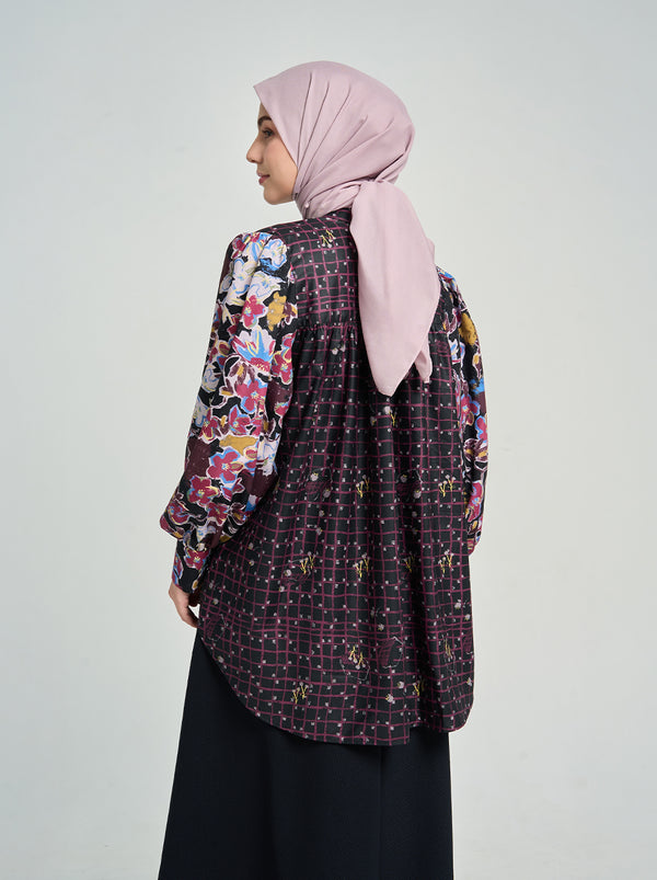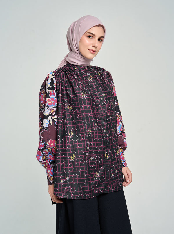 Top dengan detail kerut yang menawan di lengan dan bawah bahu. Mansetnya yang lebar memiliki banyak kancing yang stylish, menarik perhatian setiap pandangan.
