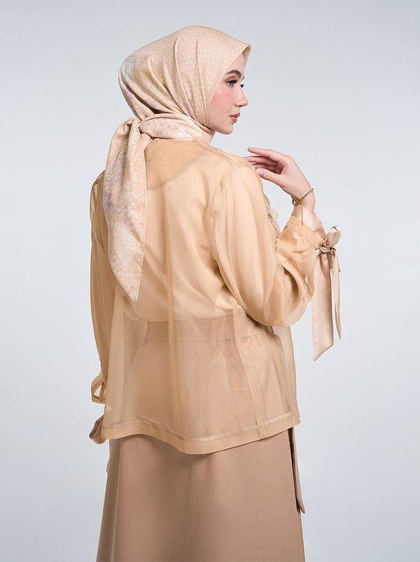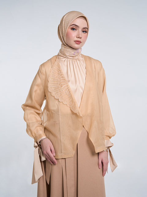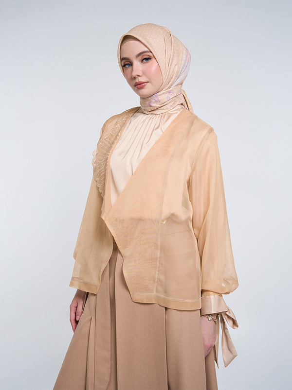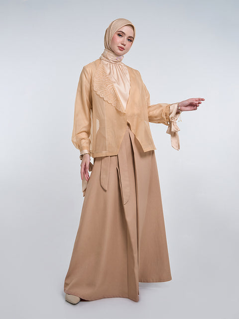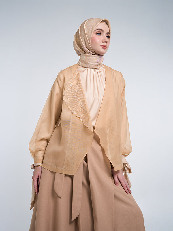 Outer transparan ini terbuat dari organza dan menampilkan lengan menggembung untuk tampilan feminin dan elegan. Utari Outer dilengkapi dengan flap samping yang dihiasi bordir kipas tradisional, menonjolkan pola Nuansa yang istimewa.