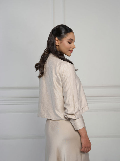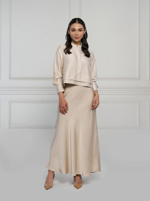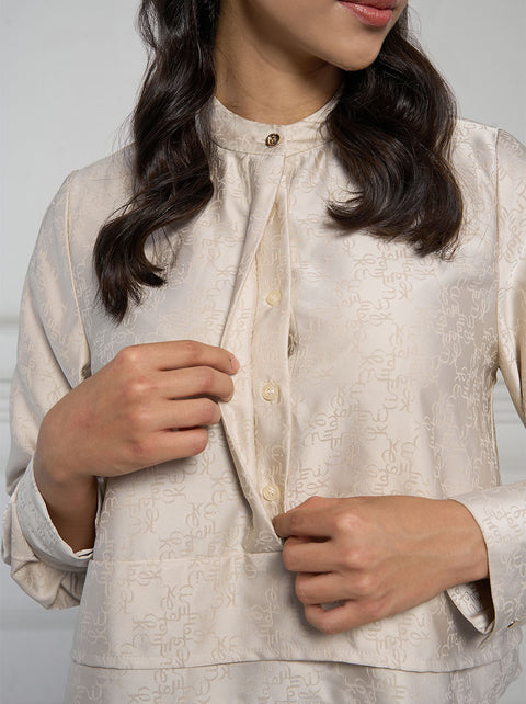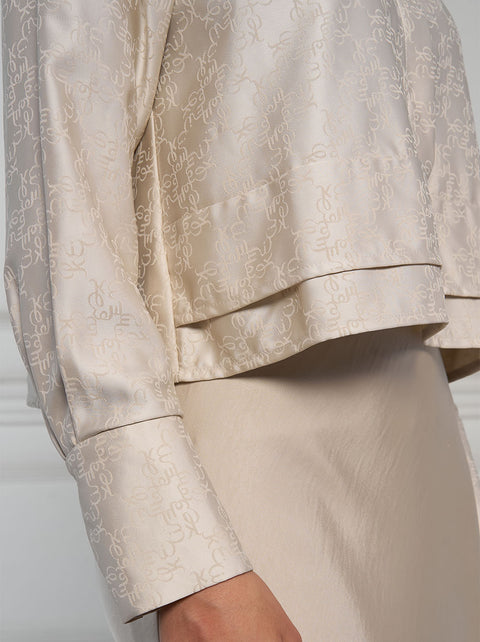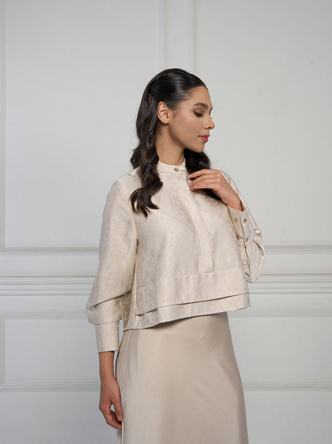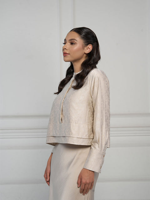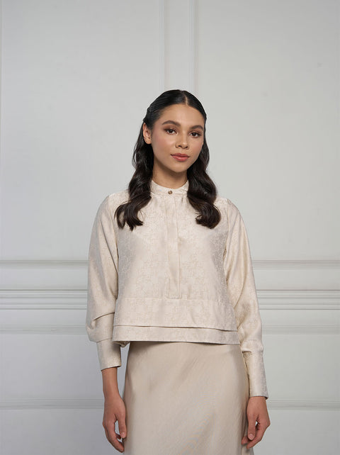 Lengkapi gaya smart casual dengan Vian Top. dalam bahan jacquard warna netral, dan kancing tersembunyi, memberi kesan rapi dalam seketika.