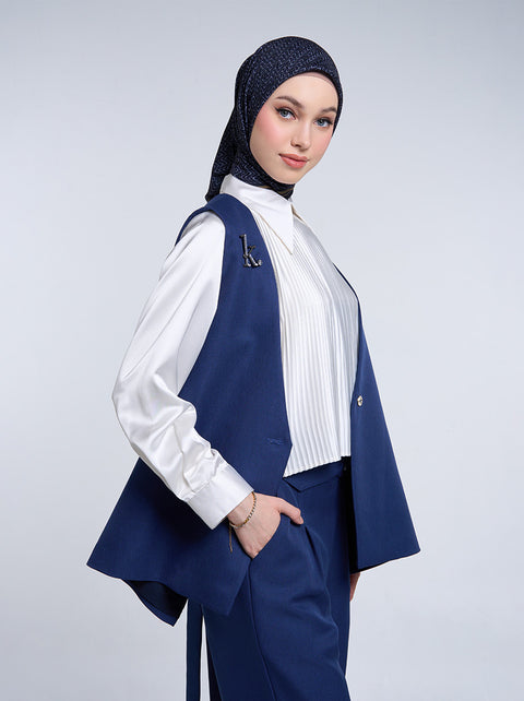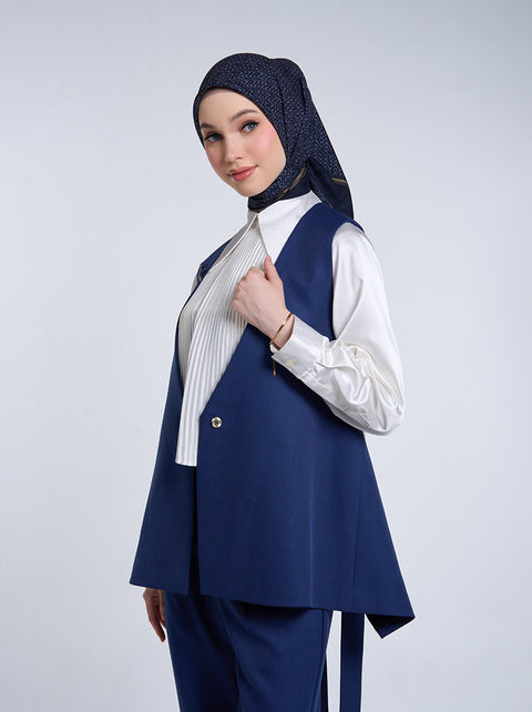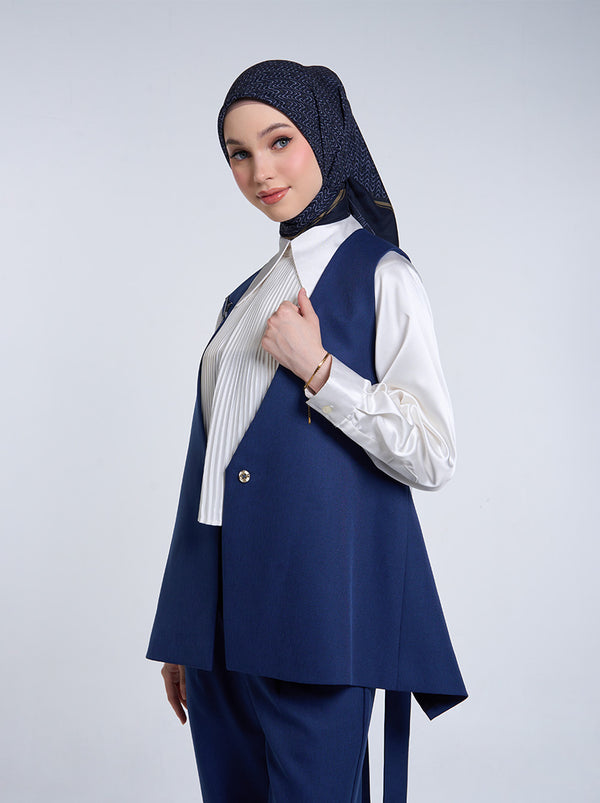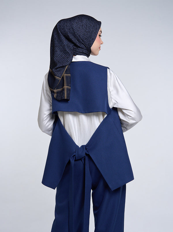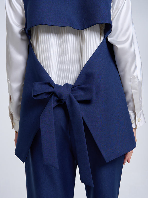This polytwill outerwear features a vest-like appearance from the front, while the back reveals a stylish twist. Vira Outer has an adjustable bow to adds a feminine touch.