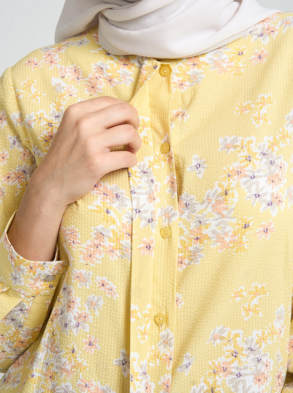 Made out of the ironless and breathable seersucker material, Willa is  the perfect daily top. Featuring hidden buttons and round neckline, this airy button up top can double as an outerwear.