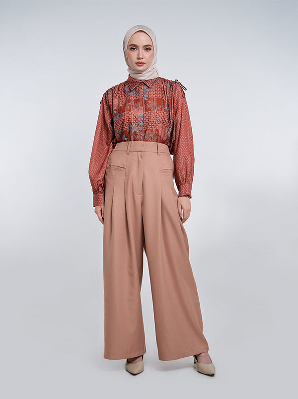Wuri Pants adalah celana stylish yang menampilkan detail lipit di bagian depan, saku depan dan belakang fungsional, belt loop yang lebar, potongan lurus, serta karet pada bagian pinggang untuk penyesuaian ukuran yang nyaman dikenakan.