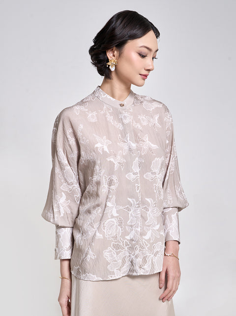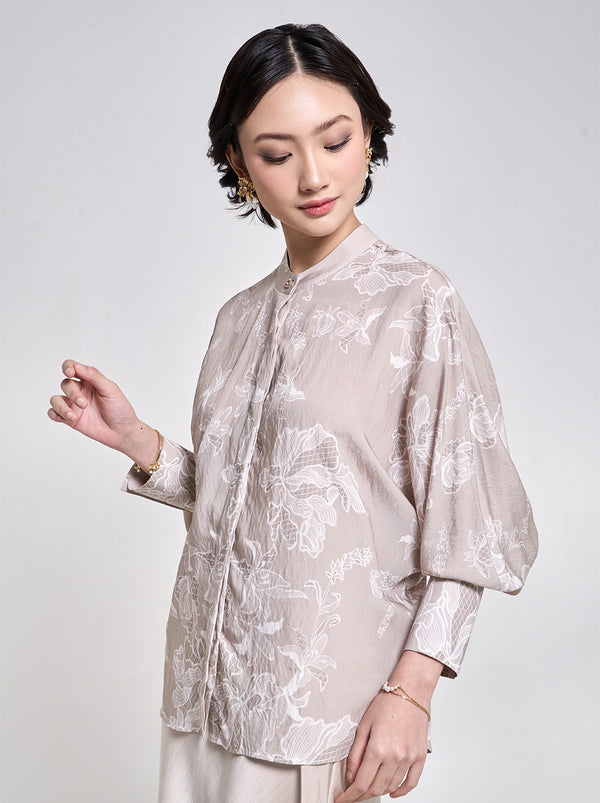 Zadia top menampilkan elemen klasik khas koleksi Aristaya. Manset tinggi memberi karakter, dan tali di belakang memberi opsi gaya.