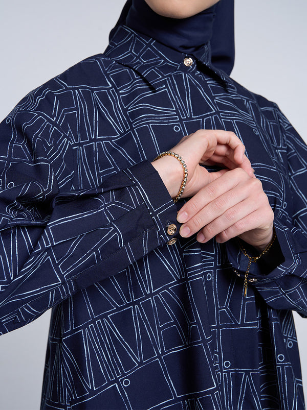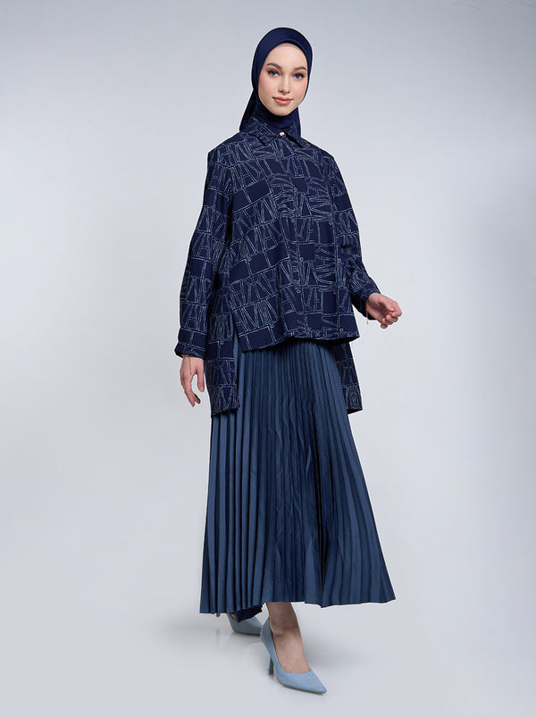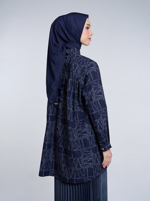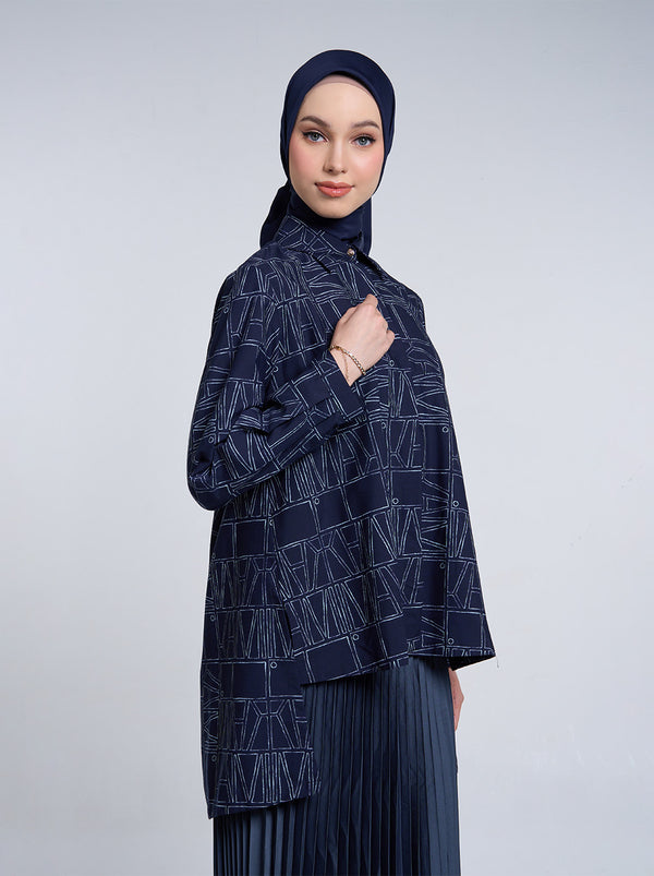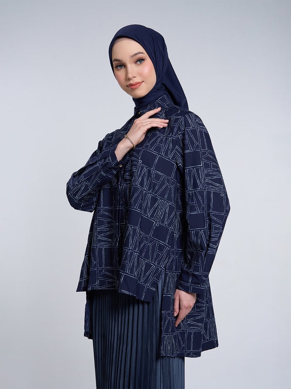 Zaline Regular Top menampilkan desain asimetris yang unik, dengan belahan di samping dan lipit kotak di belakang untuk kemudahan bergerak.