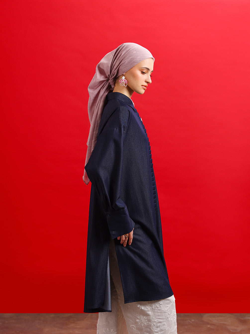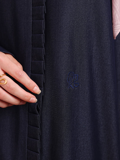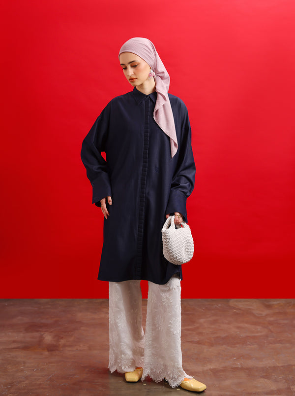 Tunik modern dengan potongan simpel berbahan denim. Dilengkapi detail manset yang standout, aksen ruffle di bagian depan, serta bordir khas Kami sebagai eksklusif melengkapi tampilan modest yang rapi dan elegan.