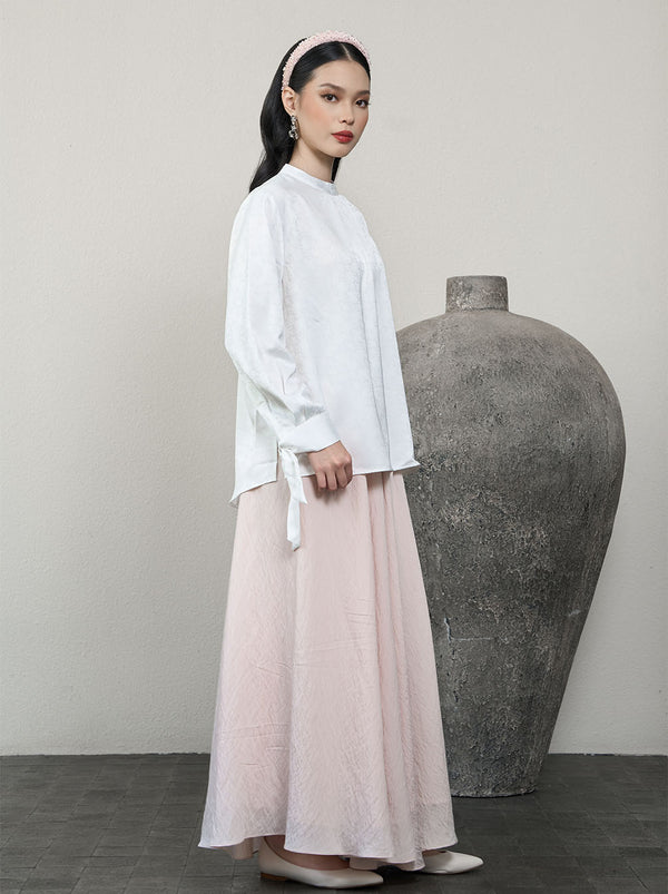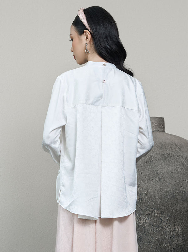 Atasan longgar dalam warna netral dan bahan satin yang mewah. Detail kerah dan manset berpita menambah dimensi pada kreasi jacquard Kami. Mono Curve.