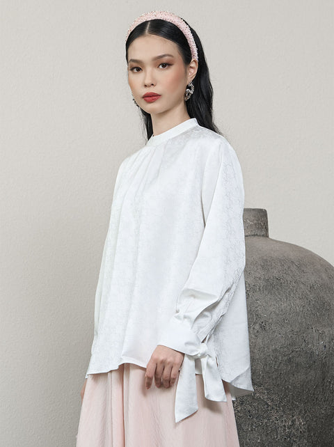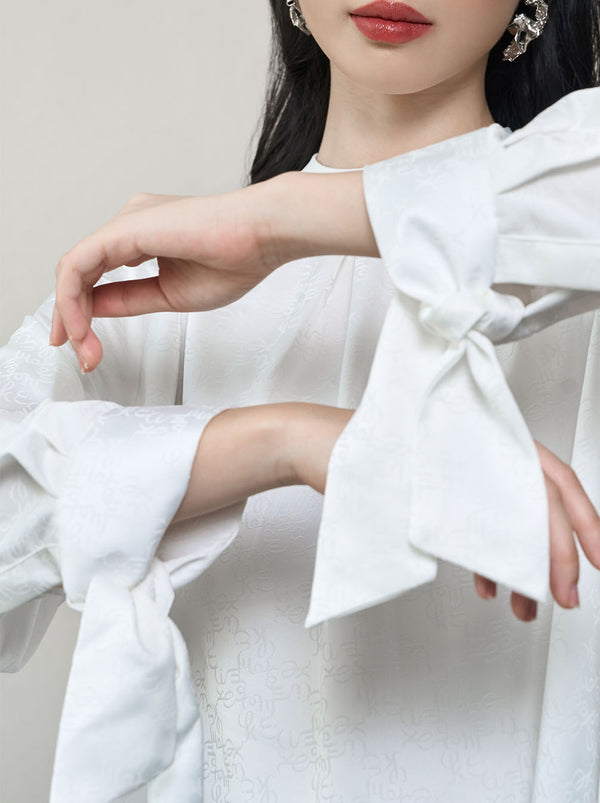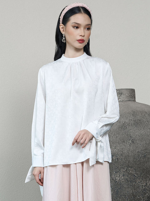 A neutral loose top with luxurious satin finish. The gathered neckline and bowed cuff add further depth to the jacquard creation.