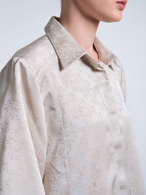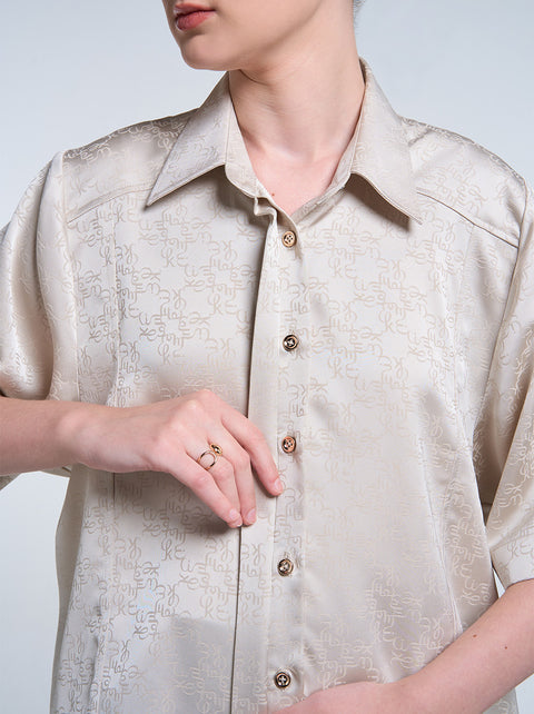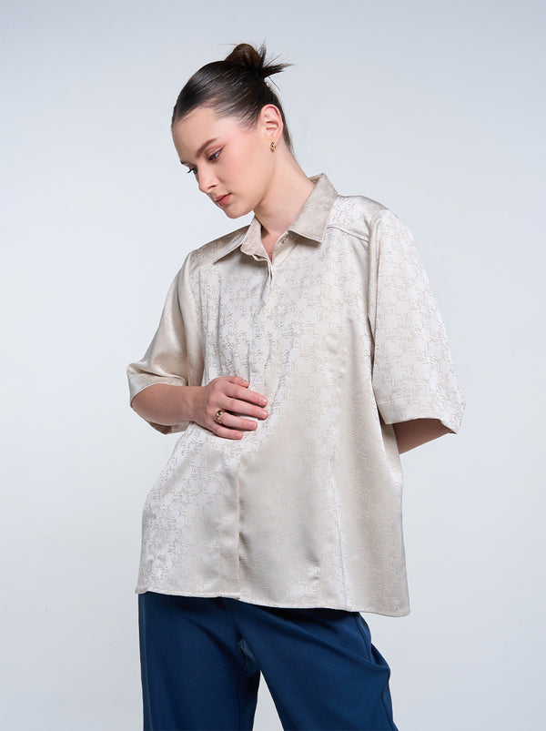 Bahan jacquard khas Kami. tampil menonjol pada Asha Top, dengan fit longgar yang memberi kesan modern pada item klasik kemeja kancing lengan pendek.