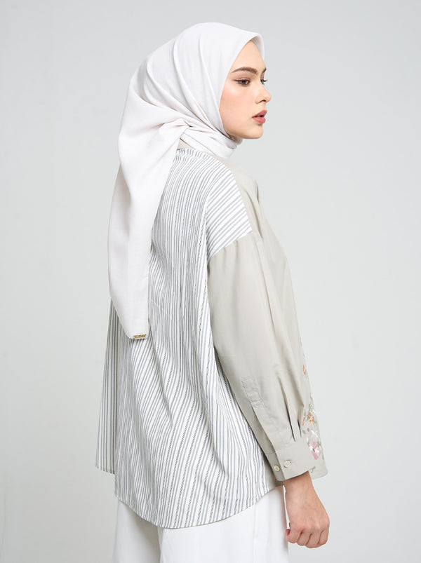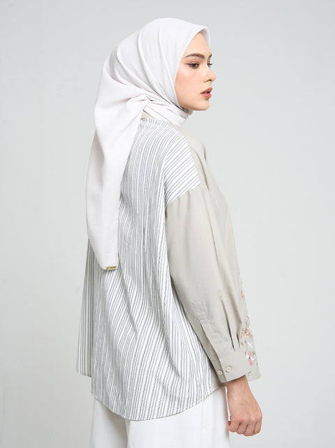 Bria Top adalah kemeja drop-shoulder kasual yang menampilkan lengan menggembung, pattern garis di bagian belakang, dan patch bunga khas Petally di bagian depan.