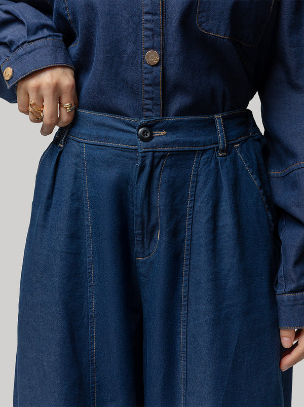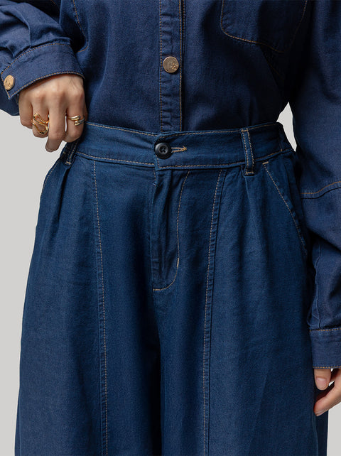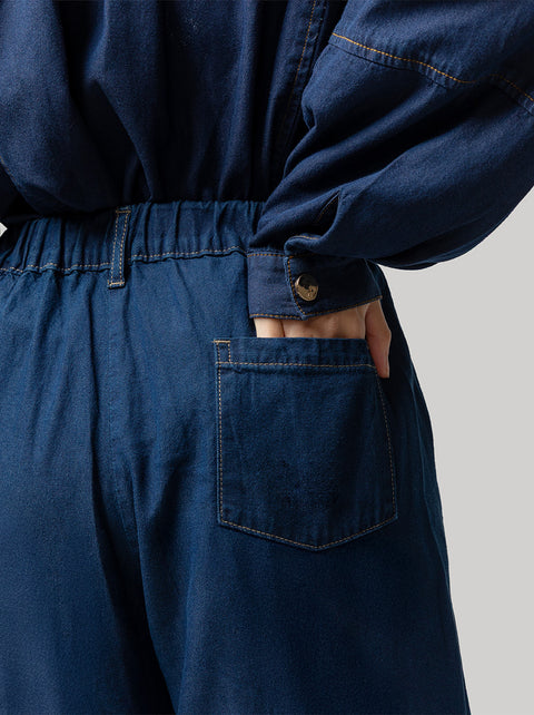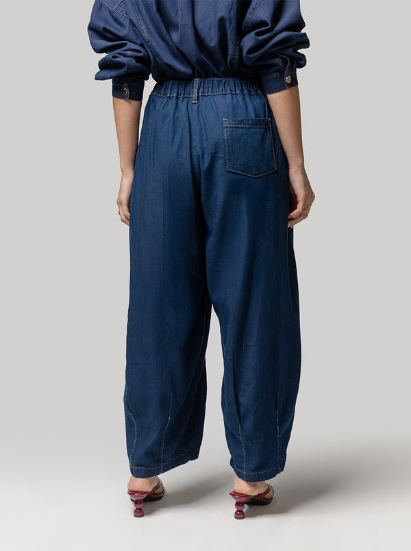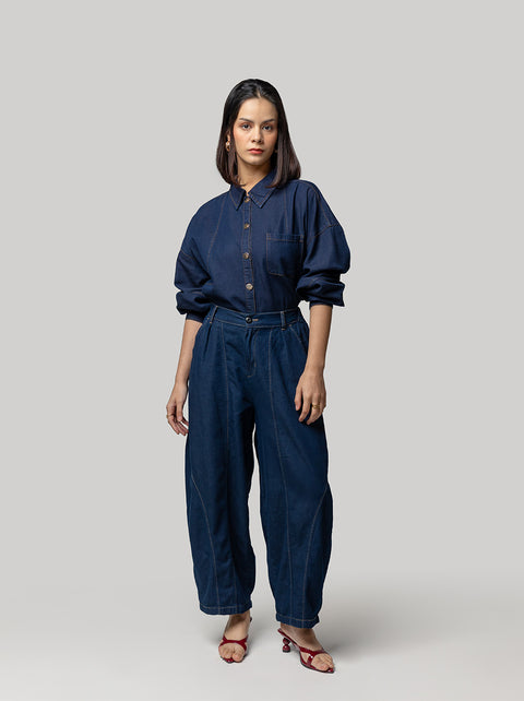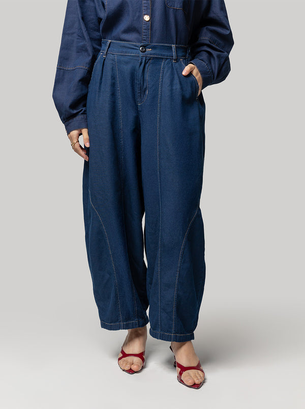 Brisa pants hadir untuk gaya denim sehari-hari yang stylish dan nyaman. Model barrel yang trendy bertemu warna biru denim klasik, dengan jahitan kontras dan saku di sisi serta belakang celana.
