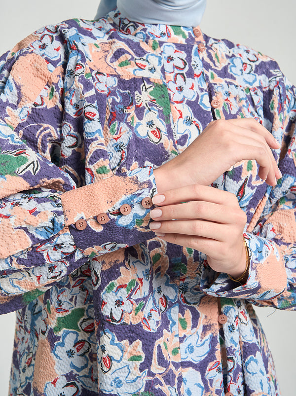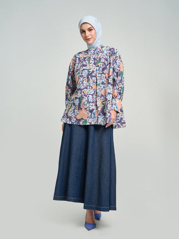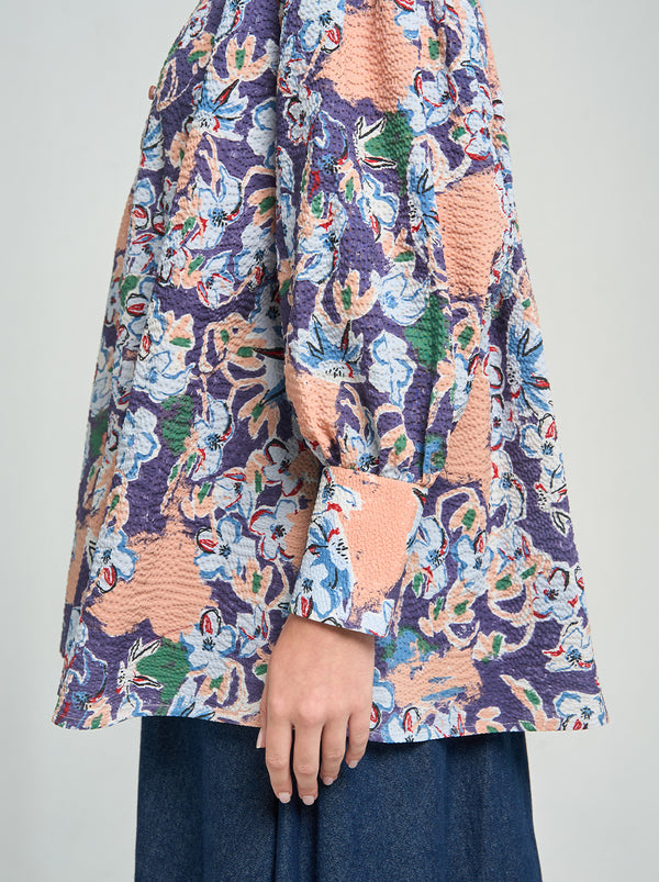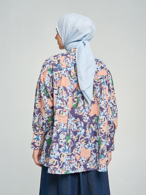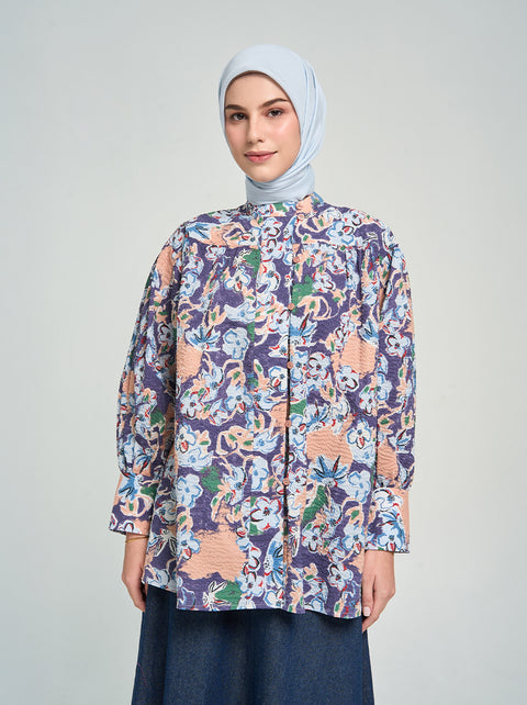 Top dengan detail kerut yang menawan di lengan dan bawah bahu. Mansetnya yang lebar memiliki banyak kancing yang stylish, menarik perhatian setiap pandangan.
