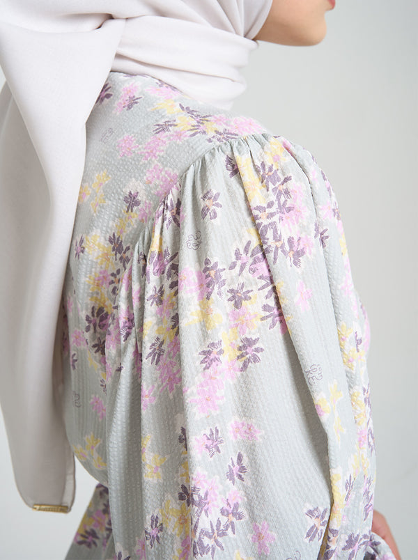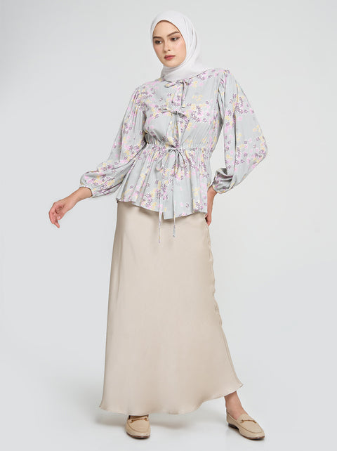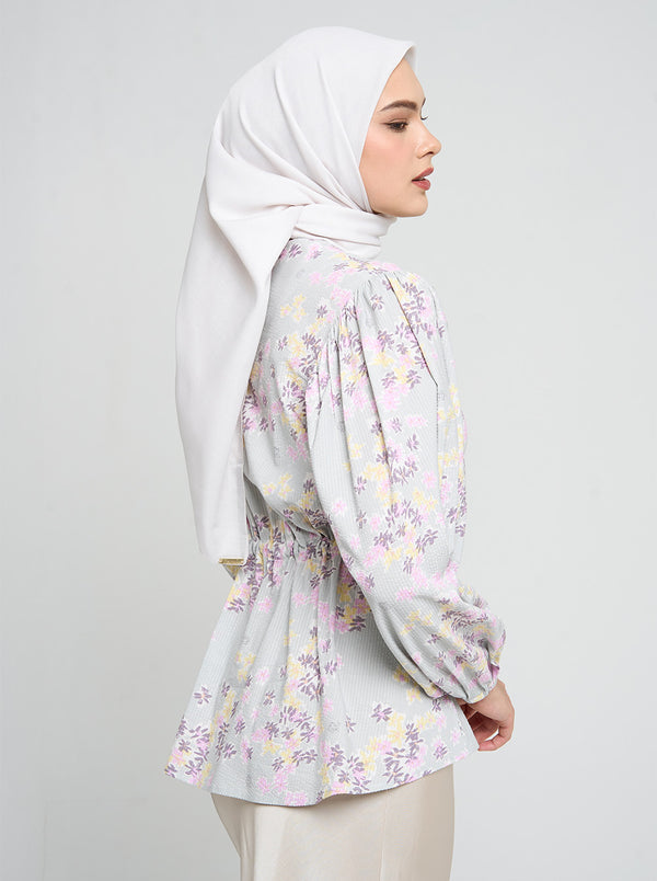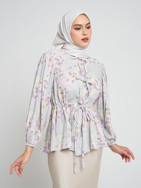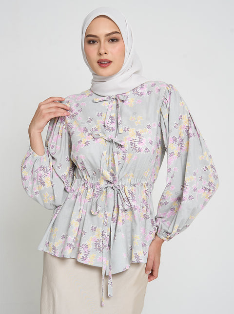 Motif floral Perimossa bertemu banyak detail unik pada Darya top. Temuka kerutan di bagian lengan, tali serut di bagian pinggang dan aksen pita di bagian depan.