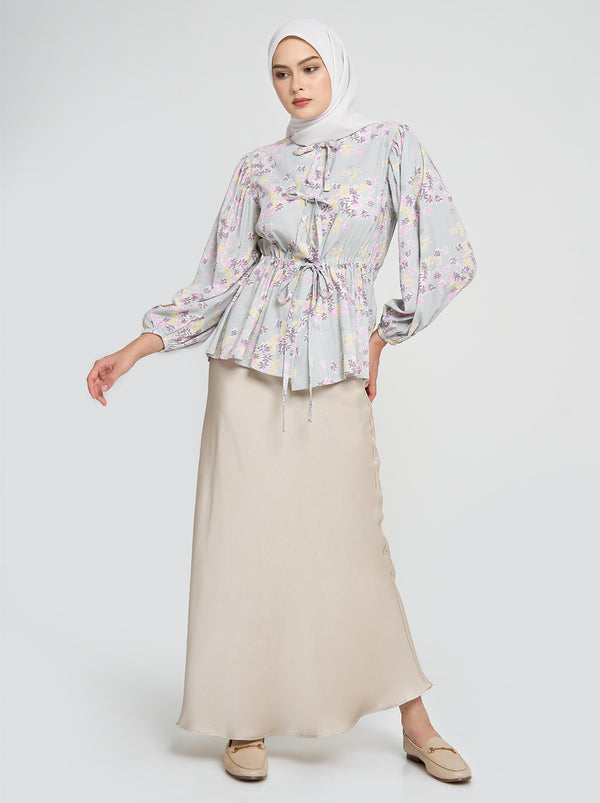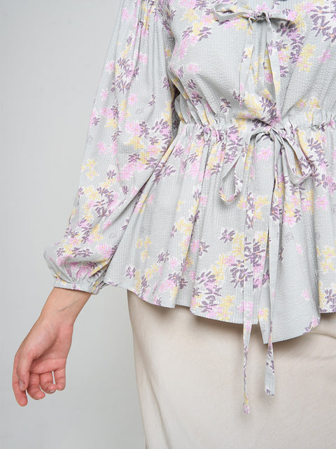Dainty Primossa florals meet playful details on Darya top. Find ruching on the sleeves, adjustable drawstring and DIY bows down the front.