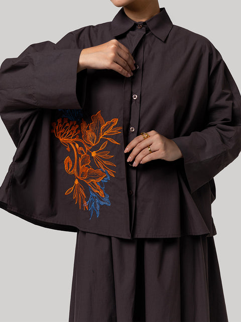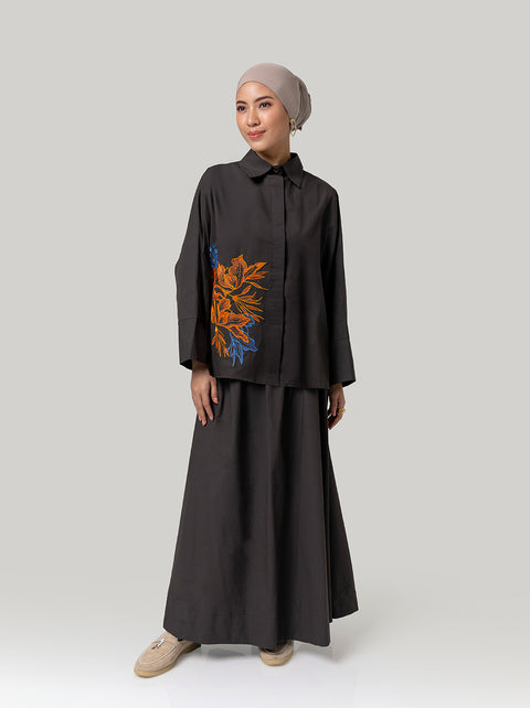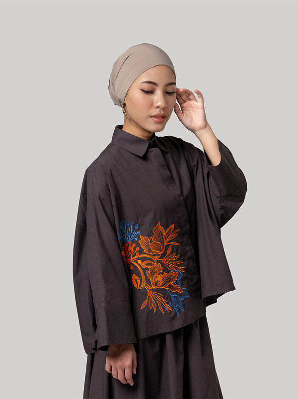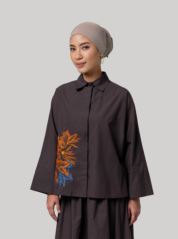 Kemeja garis-garis klasik dengan bordir floral yang cantik. Elara top hadir dengan siluet longgar, lengan batwing dan manset lebar yang menambah kenyamanan.