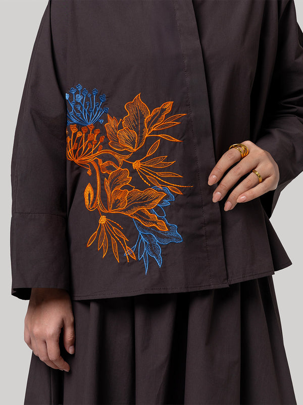 Embroidery twist over a classic striped shirt. Elara top features a relaxed sihouette with batwing and wide cuff.