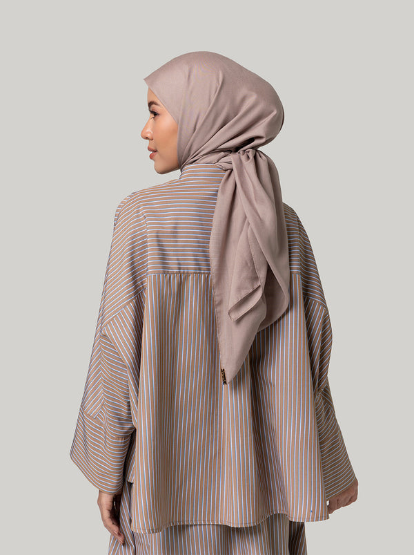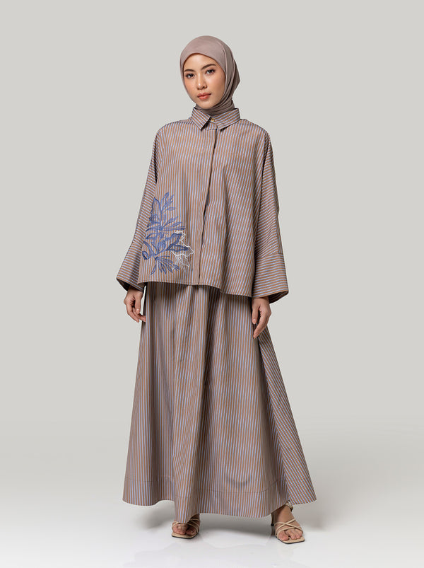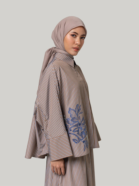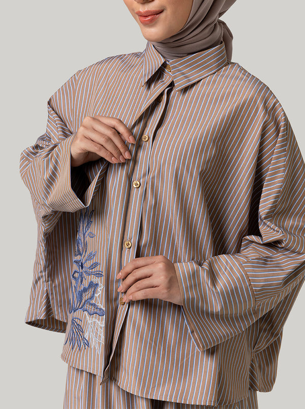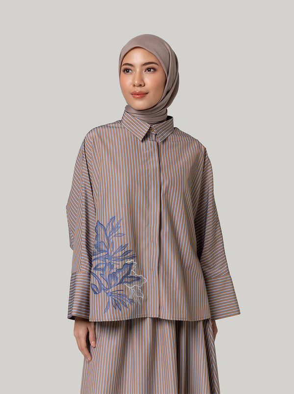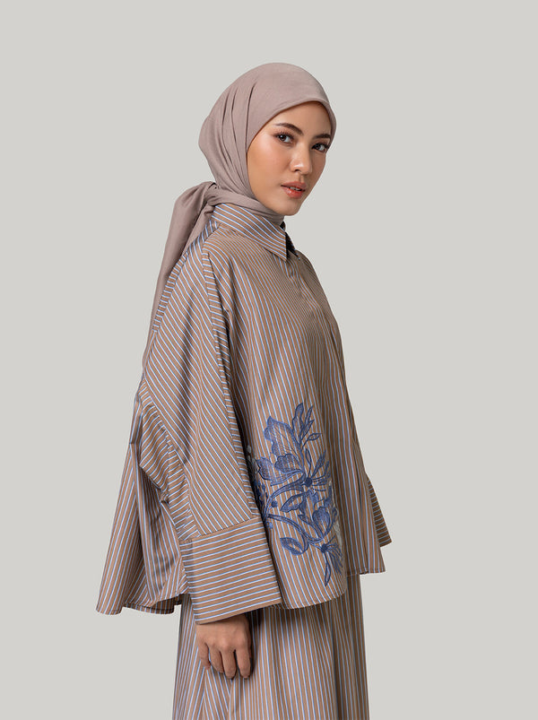 Kemeja garis-garis klasik dengan bordir floral yang cantik. Elara top hadir dengan siluet longgar, lengan batwing dan manset lebar yang menambah kenyamanan.