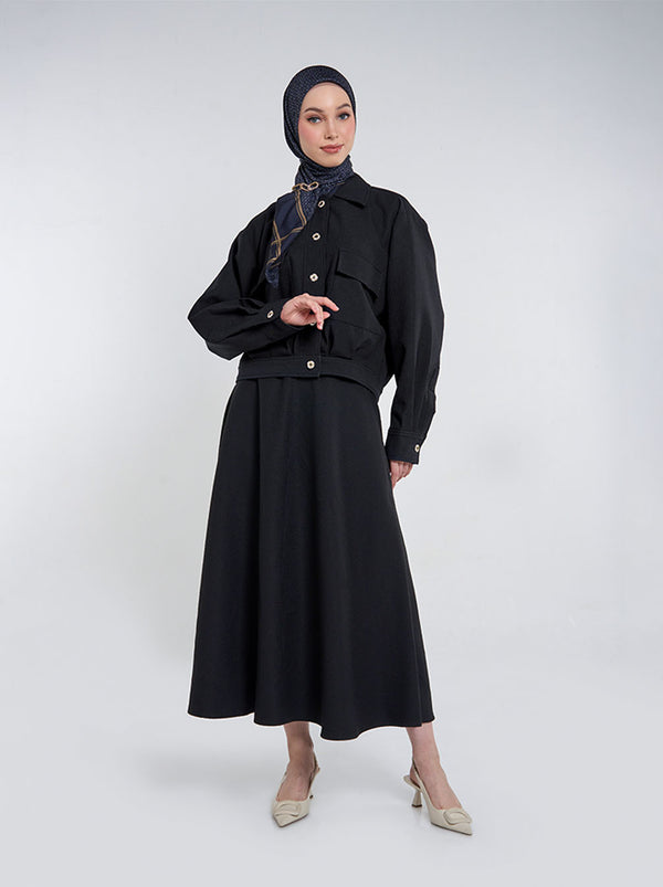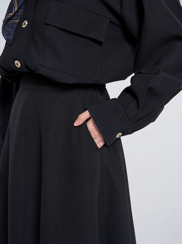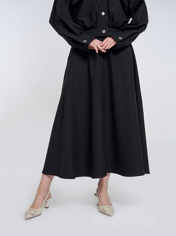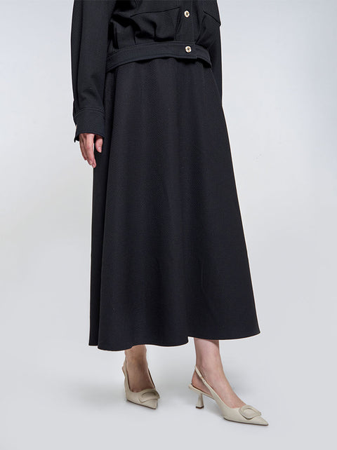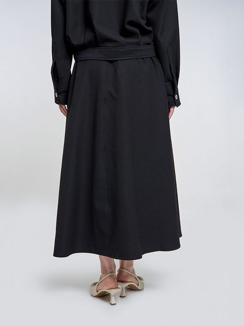 The Elea Skirt is an A-line skirt with functional side pockets. Made of lightweight polyester with designed volume, creates a flouncy effect as you walk.