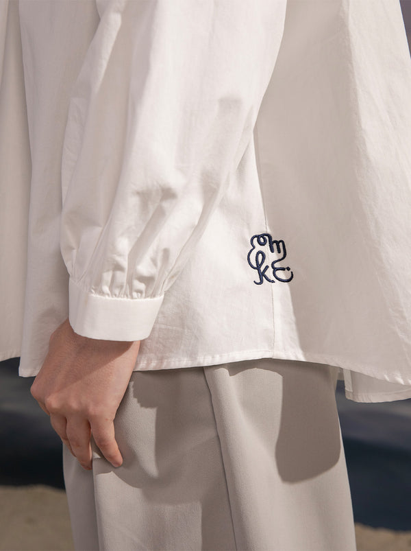 Classic cotton shirt gets a makeover with Elline top's charming details: Kami. monocurve embroidery, heart tab and boxy pleat.