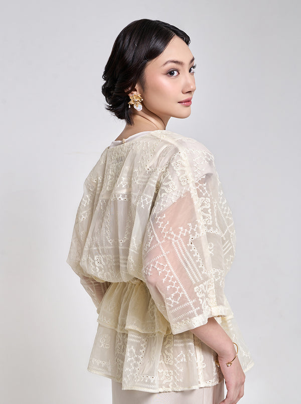 Complete your romantic look with Ella outer. In sheer embroidery material and tiered design, giving depth to any look.