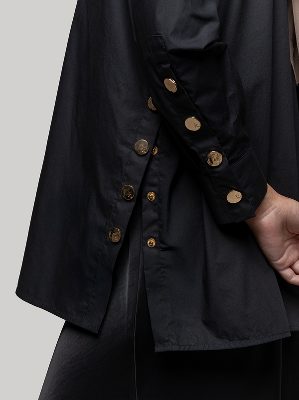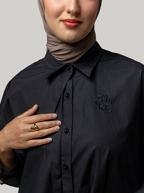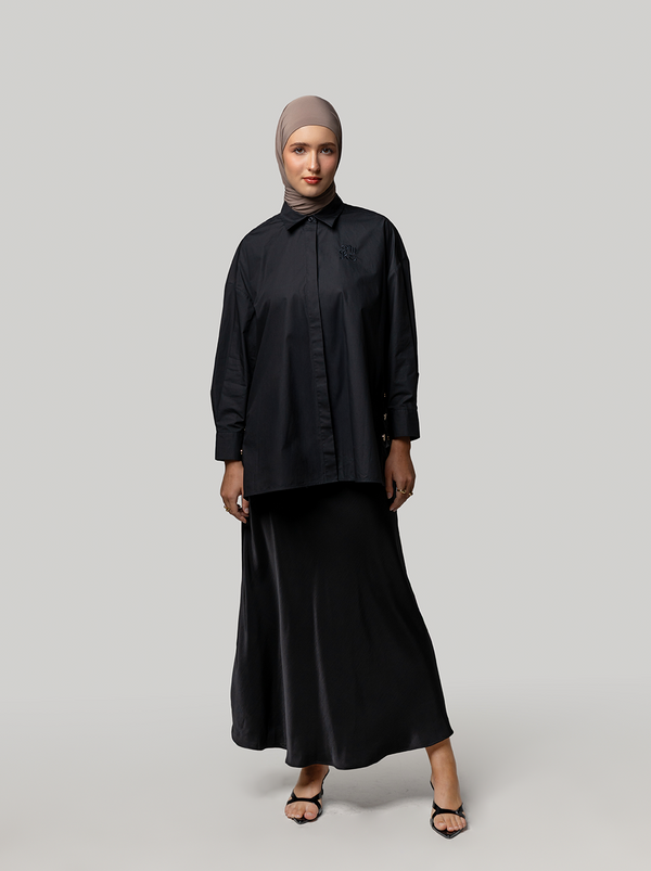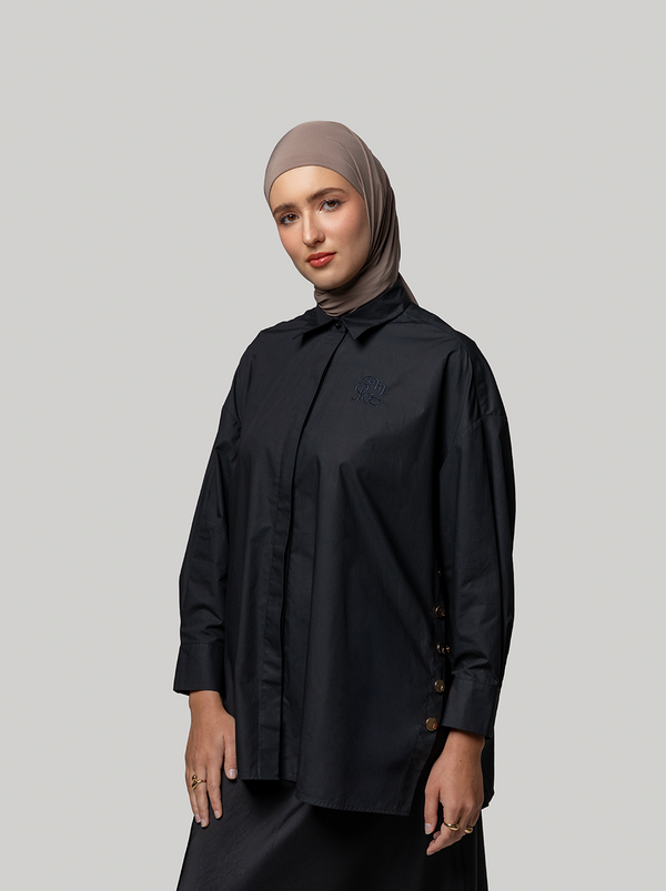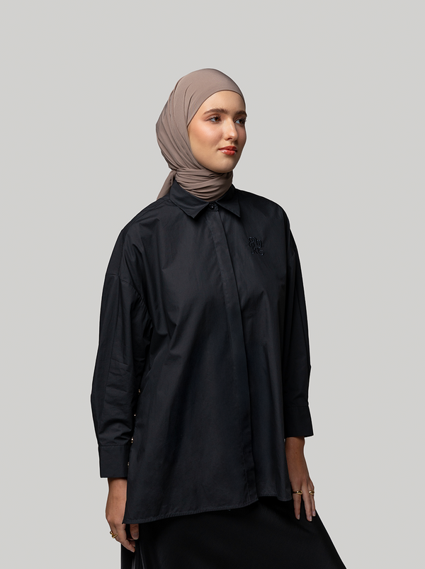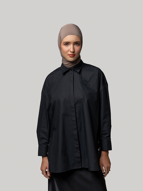 The Gale Oversized Top stands out with its vibrant colors and detailed Kami Monocurve embroidery on the front, adding an artistic touch. Side slits with button clip details give it a modern edge, making it a bold and stylish choice for any occasion.