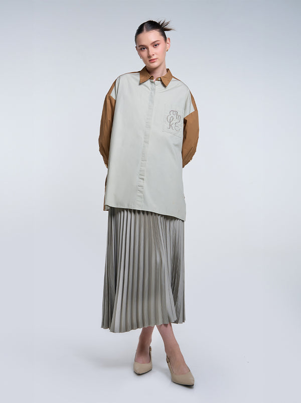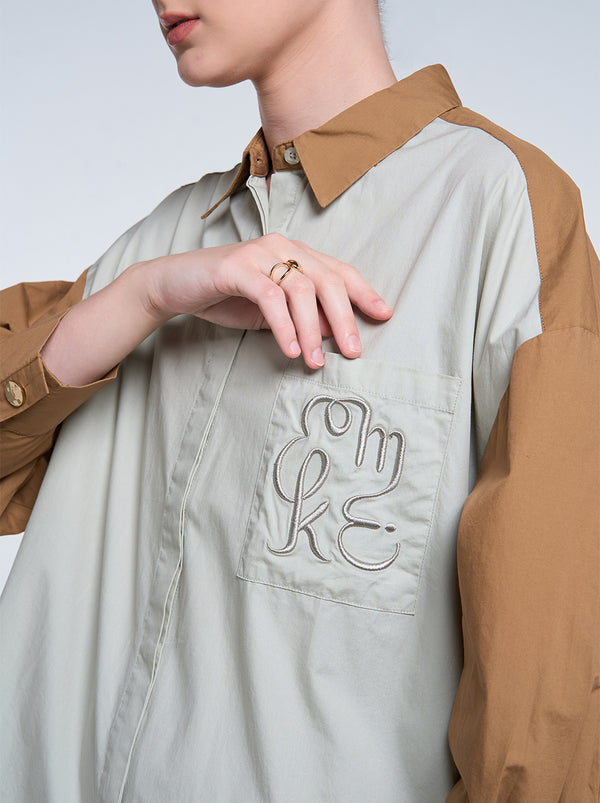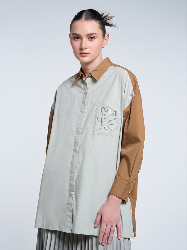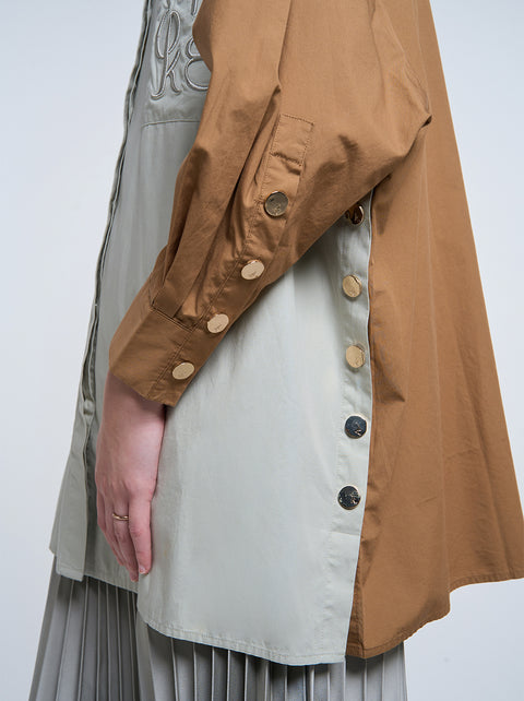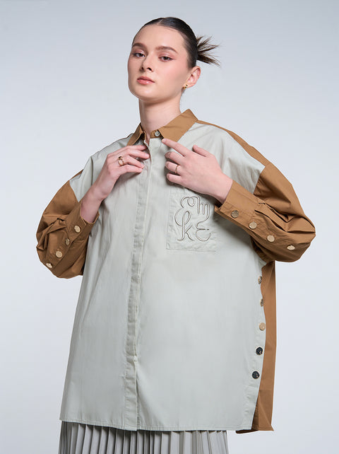 The Gale Oversized Top showcases small yet stylish details, featuring side slits adorned with gold buttons, a striking two-tone design, and signature embroidery on the pocket.